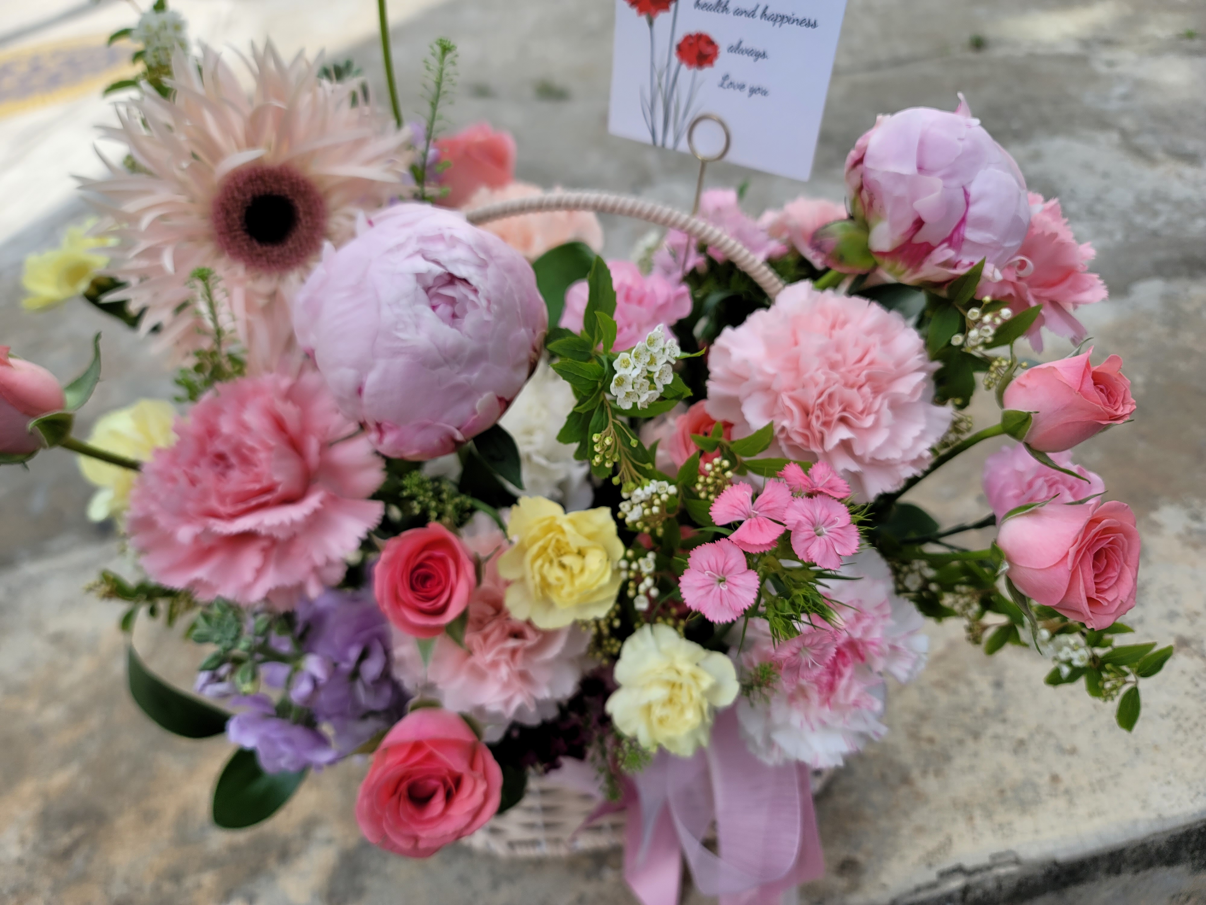 세 번째로 인기 있는 스타일은 '작약 중심 미니바구니'예요. 작약을 메인으로 하고, 그 주변에 작고 화사한 카네이션들을 둘러 배치하는 방식이에요. 바구니 자체는 작고 아담하지만, 포인트가 확실해서 받는 사람에게 강한 인상을 줘요. 특히 사진 찍었을 때 정말 예쁘게 나와요.