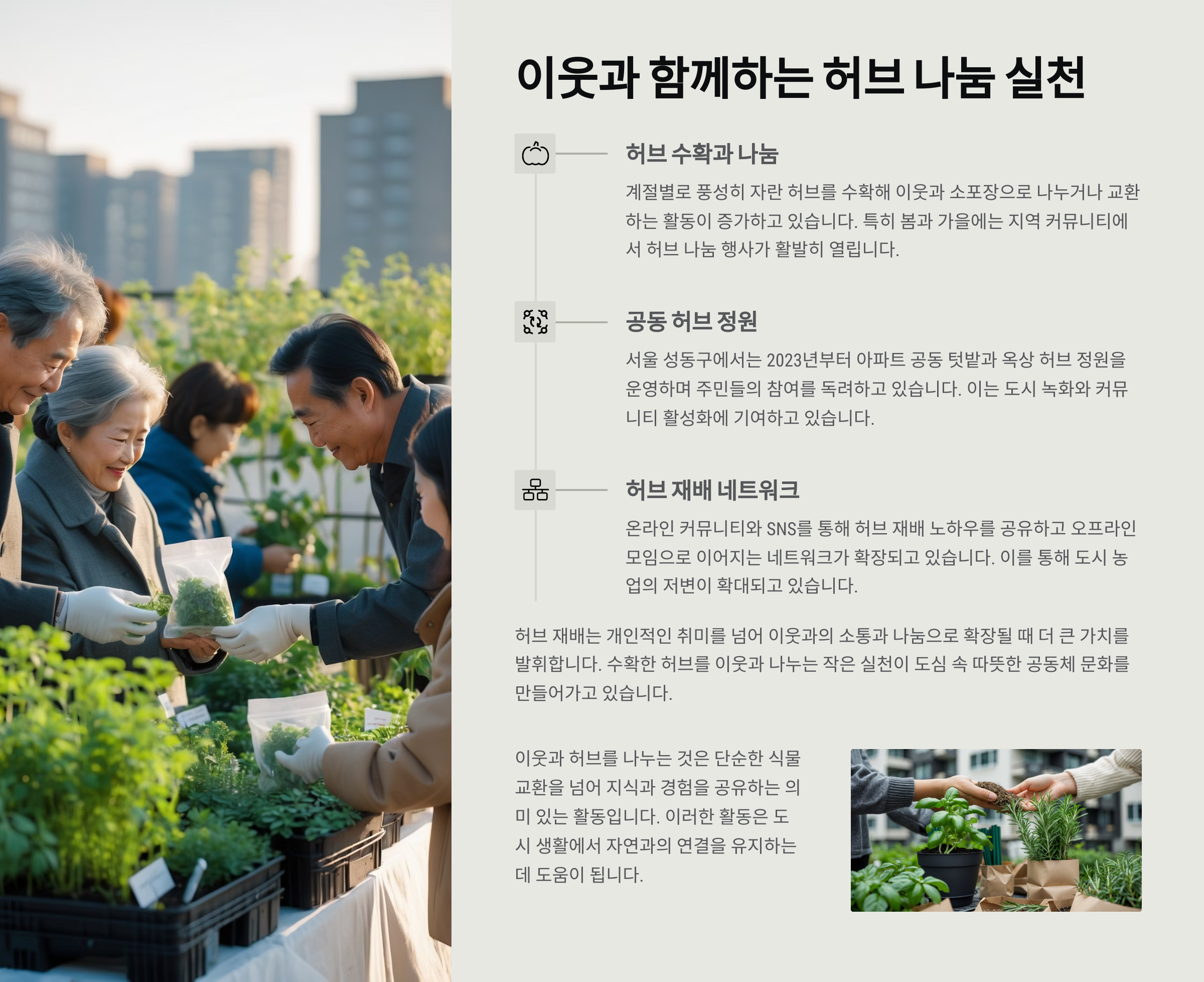 요즘은 ‘이웃 공유 텃밭’ 같은 개념으로 옥상정원이나 공동 베란다에서 허브를 함께 기르는 경우도 있어요. 서로 다른 허브를 맡아서 기르면서 나중에 수확한 걸 나누는 방식이에요. 이런 문화는 도시 속에서 정서적 풍요로움을 더해주기도 해요.