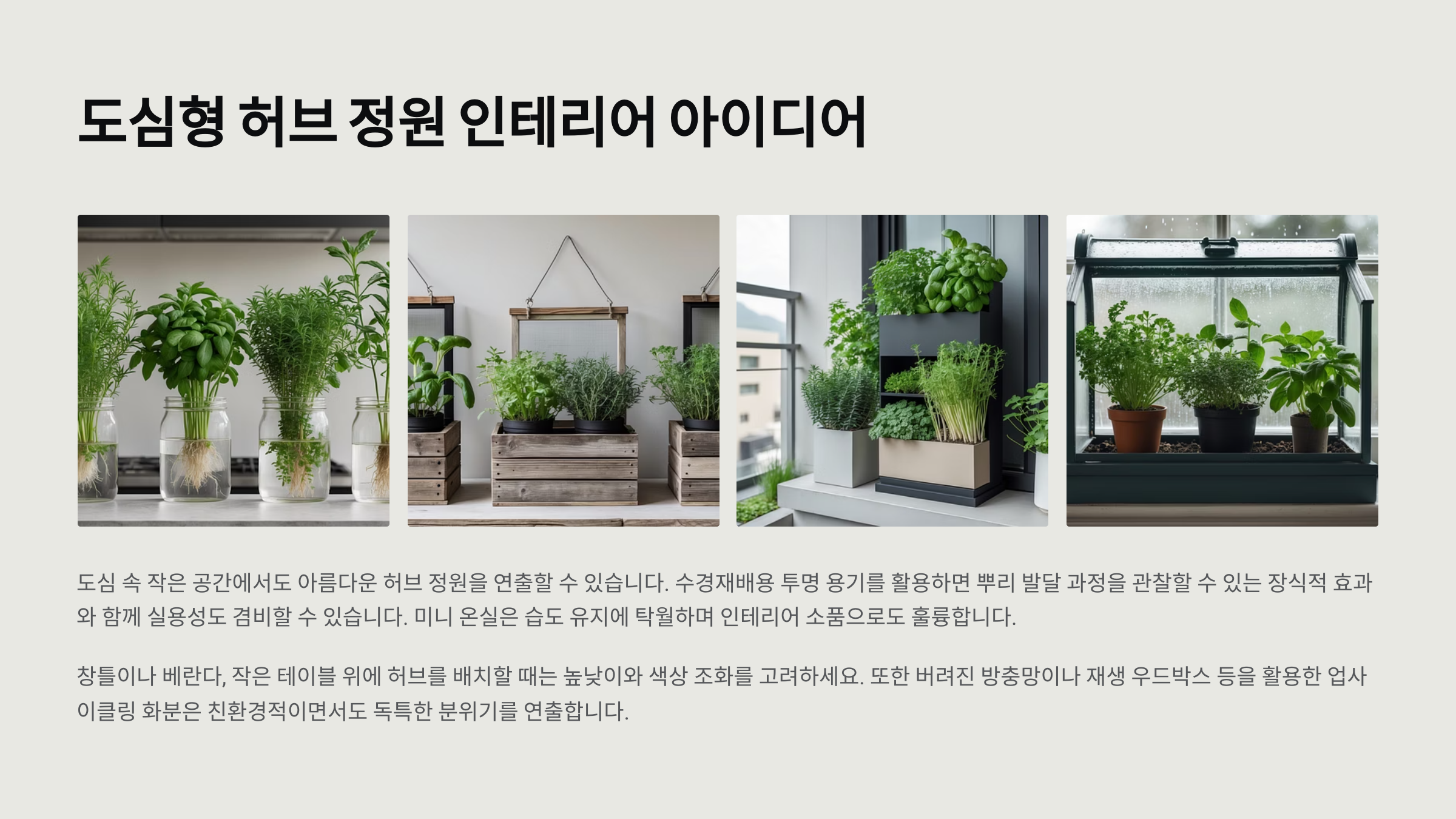 마지막으로 한 가지 팁! 도심형 허브 정원에는 의자 하나만 있어도 전혀 다른 분위기가 연출돼요. 아침 햇살 아래 커피 한 잔과 허브 향기, 상상만 해도 기분 좋아지지 않나요?