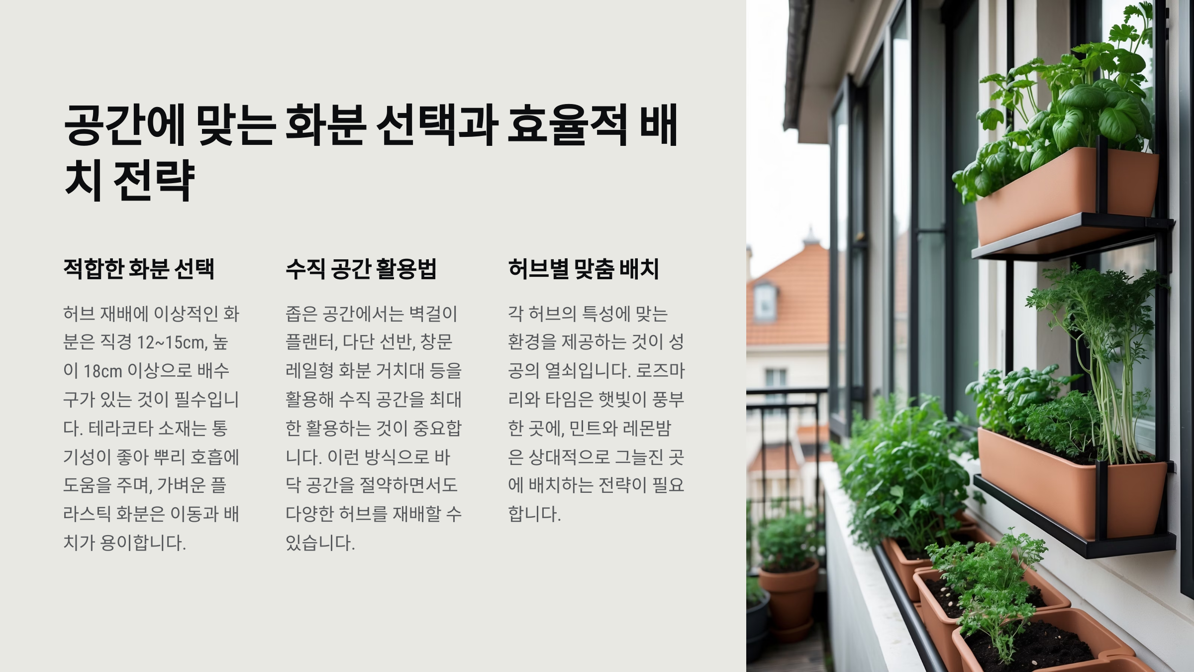 좁은 베란다에서도 허브는 충분히 잘 자랄 수 있어요. 중요한 건 공간을 어떻게 활용하느냐예요. 세로 공간을 활용하면 가로 면적이 작아도 다양한 허브를 키울 수 있답니다. 벽걸이형 화분이나 3단 선반은 공간 효율을 극대화해줘요.