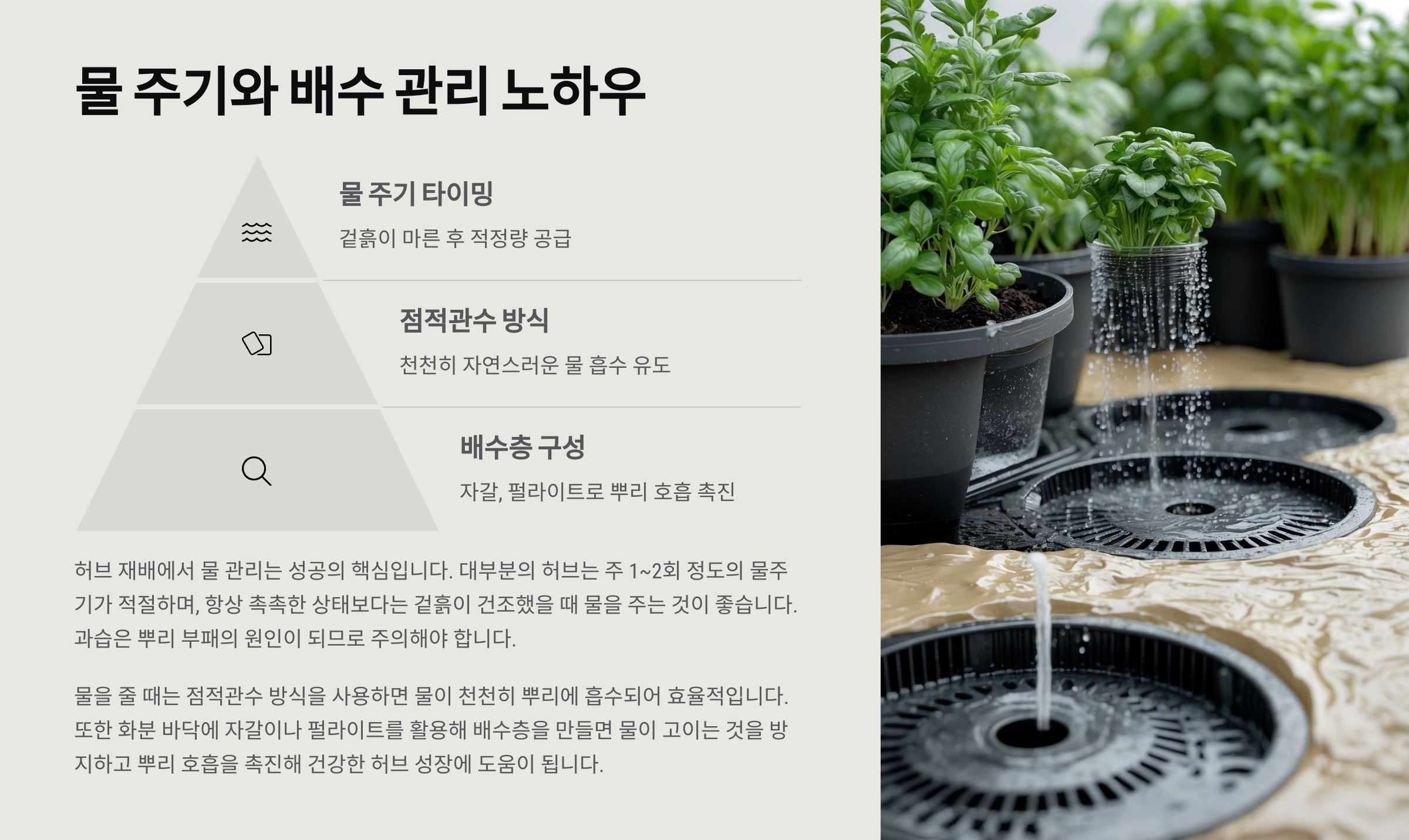 허브를 건강하게 키우는 데 있어서 물 조절은 정말 핵심이에요. 너무 자주 주면 뿌리가 썩고, 너무 적게 주면 허브가 마르기 쉬워요. 중요한 건 허브의 종류와 흙 상태를 관찰하며 물 주기를 조절하는 거예요.
