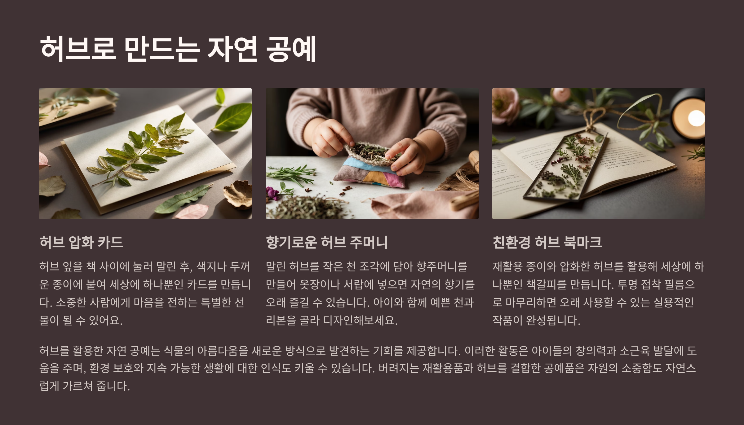 공예 활동은 단순한 만들기를 넘어 아이에게 자연을 담은 감각적인 기억을 남겨줘요. 허브로 손쉽게 만들 수 있는 다양한 작품은 아이에게 성취감도 선물하고, 가족과의 추억도 만들어준답니다.