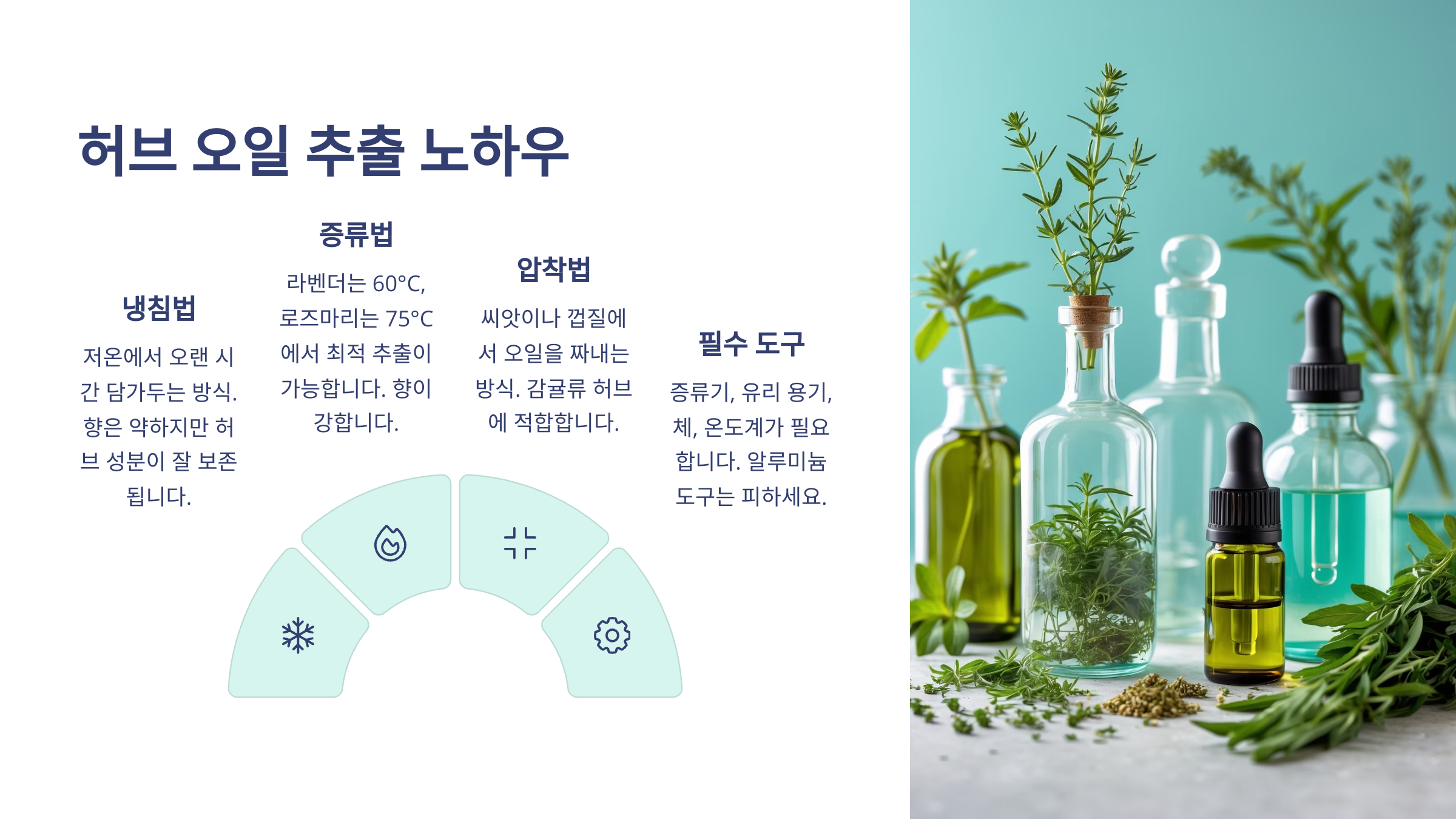 가정에서 가장 쉽게 할 수 있는 추출법은 냉침(인퓨징) 방식이에요. 오일에 허브를 넣고 시간에 따라 천천히 우려내는 방법인데, 특별한 장비 없이도 누구나 할 수 있어서 입문자에게 딱이에요.