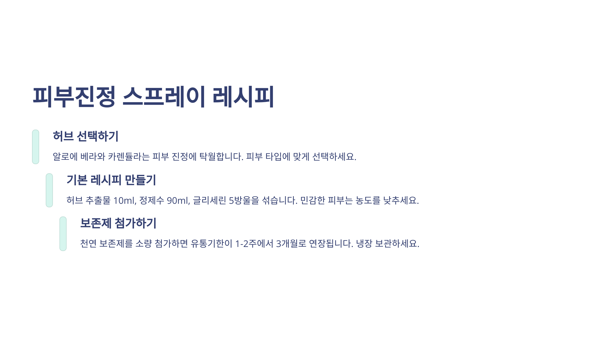 라벤더, 카모마일, 레몬밤은 피부 진정에 아주 좋은 허브들이에요. 이 세 가지를 활용하면 여름철에도 안심하고 사용할 수 있는 천연 쿨링 스프레이를 만들 수 있어요. 특히 땀띠나 가려움에도 도움을 줄 수 있답니다.