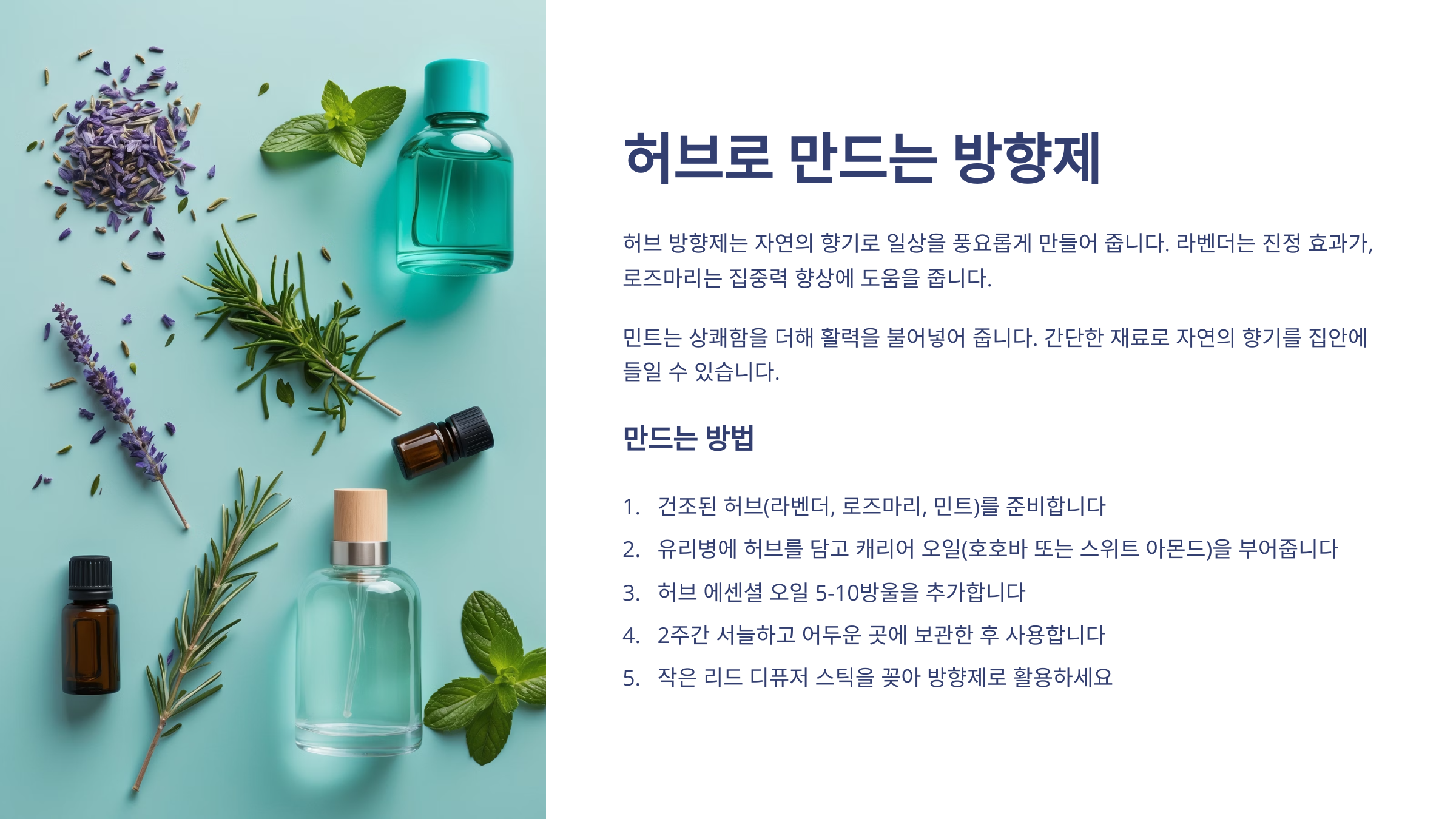 허브의 향을 가장 손쉽게 즐길 수 있는 방법은 바로 방향제를 만드는 거예요. 상쾌하고 자연스러운 향이 실내 공기를 정화하고, 기분까지 맑게 만들어줘요. 특히 인공향에 민감한 분들에게는 허브 방향제가 딱이에요.