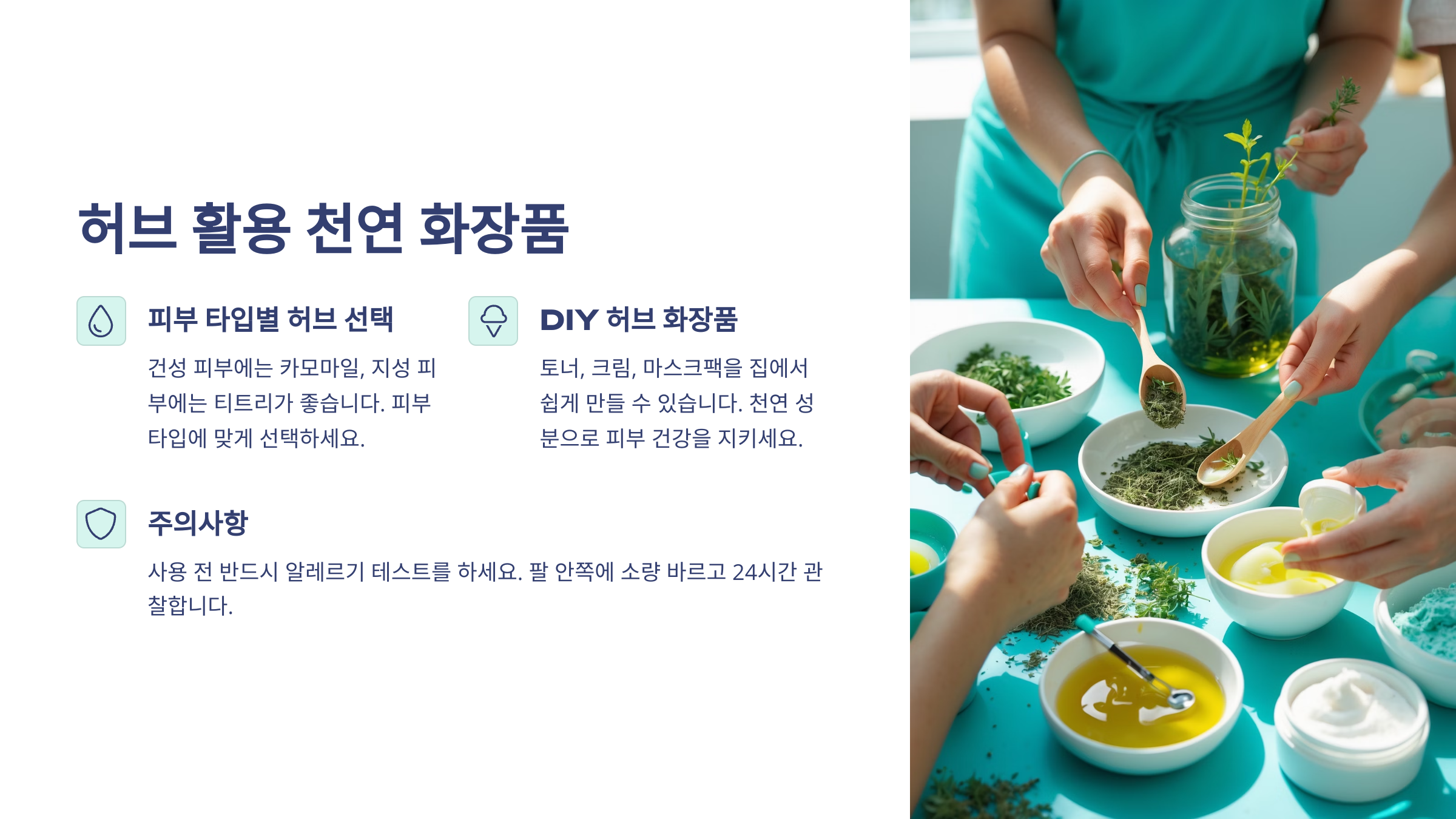허브는 천연 성분이 가득해서 민감한 피부에도 부담 없이 사용할 수 있어요. 특히 직접 만든 화장품은 화학 성분이 없고, 내가 원하는 재료만 넣을 수 있어서 믿고 바를 수 있다는 점이 가장 큰 장점이에요.