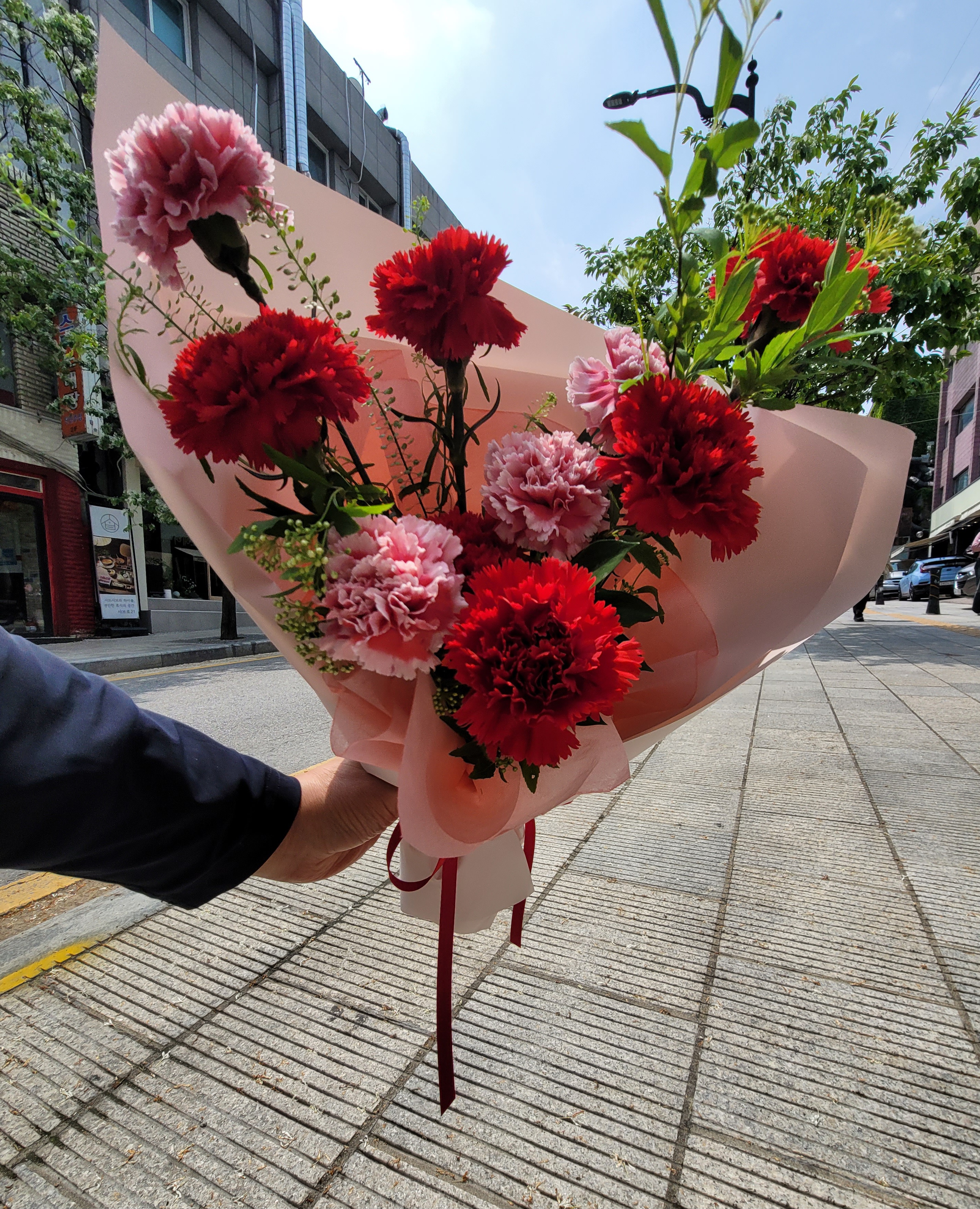 꽃다발은 너무 화려하지 않게, 카네이션과 작은 안개꽃으로 구성했어요. 은은하고 부드러운 느낌이 은사님의 따뜻한 성품과 꼭 닮아 있었어요. 꽃을 고르는 순간마저도 참 설렜어요.