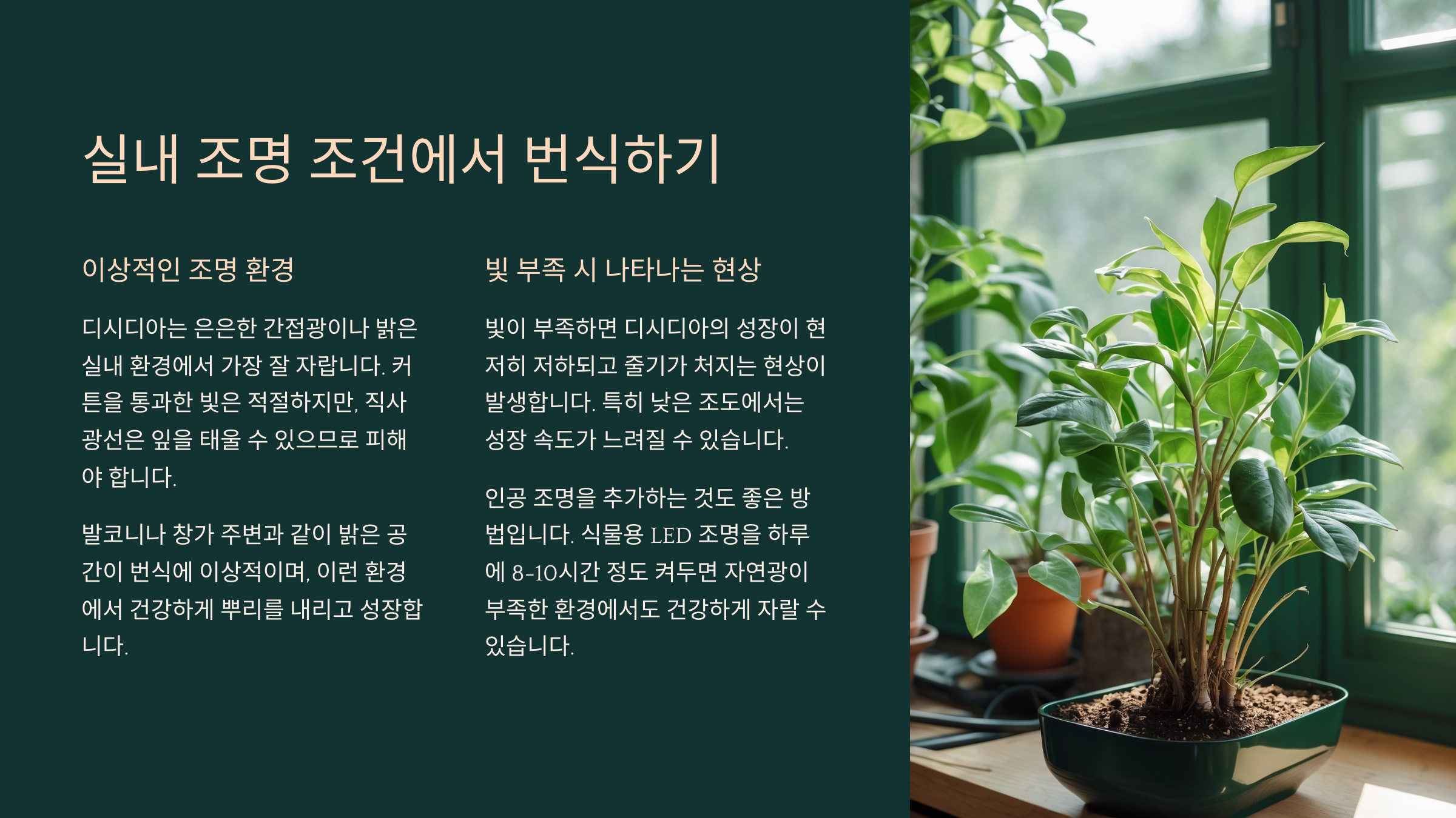 이제 디시디아가 안정적으로 뿌리를 내릴 수 있는 기본 토대가 마련됐다면, 다음은 실내 조명 환경에서 어떻게 더 잘 키울 수 있는지 살펴볼 차례예요. 조명도 디시디아 성장에 정말 중요한 요소니까요.