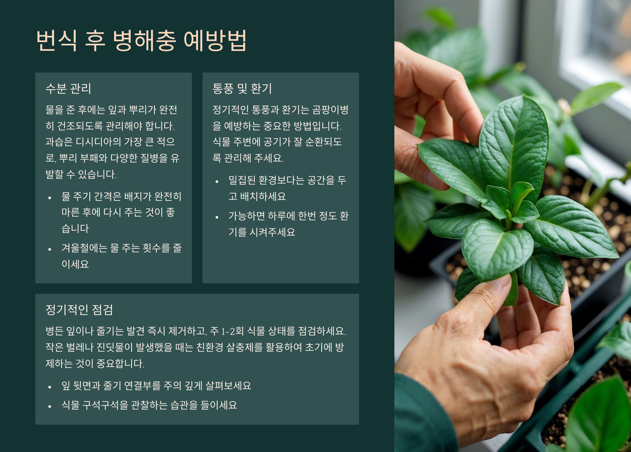번식 후 1~2주간은 하루에 한 번씩 잎과 줄기를 가까이서 들여다보며 점검하는 것이 좋아요. 이렇게 꾸준히 관리해주면 병해를 초기에 잡을 수 있고, 건강하게 자라나는 걸 보는 즐거움도 크답니다.