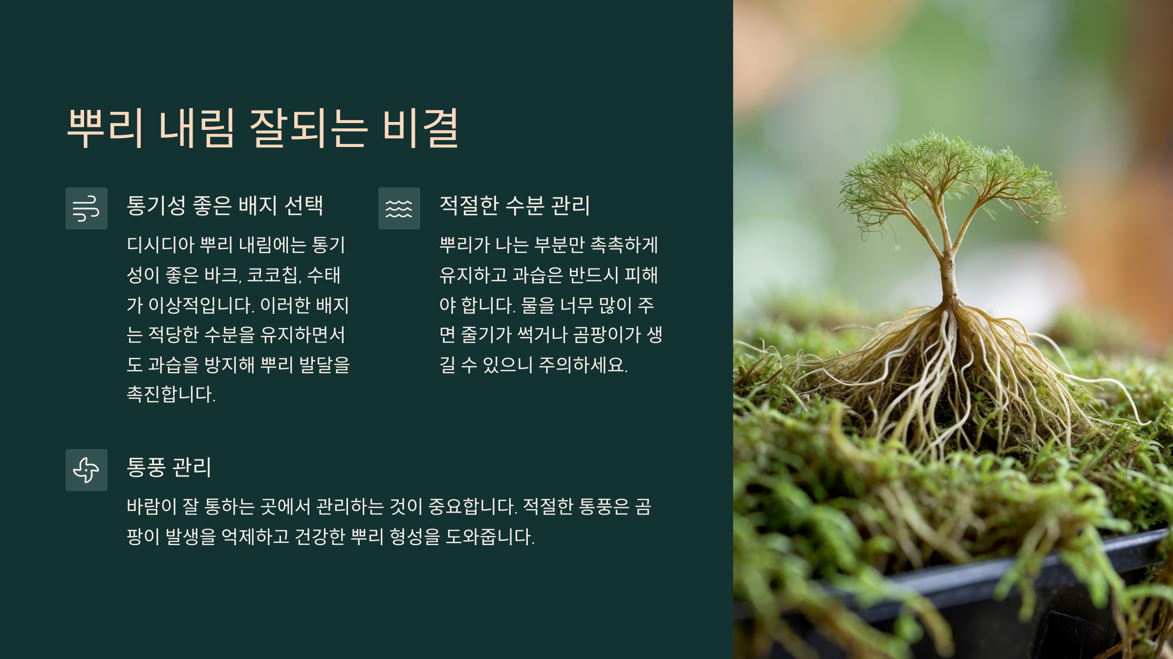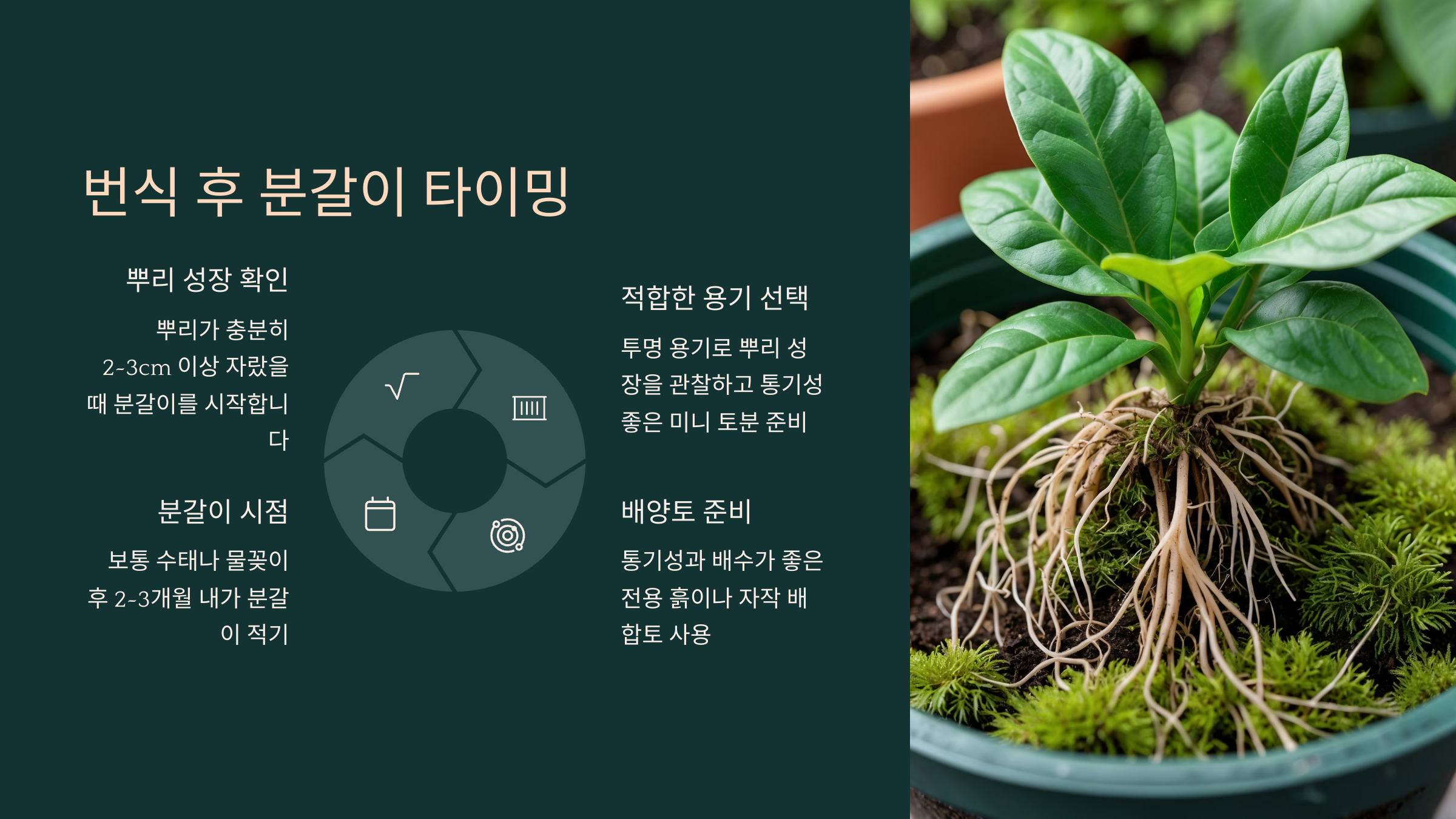 | 분갈이 시기 | 뿌리 2~3cm 이상일 때 | 너무 일찍 옮기지 않기 |