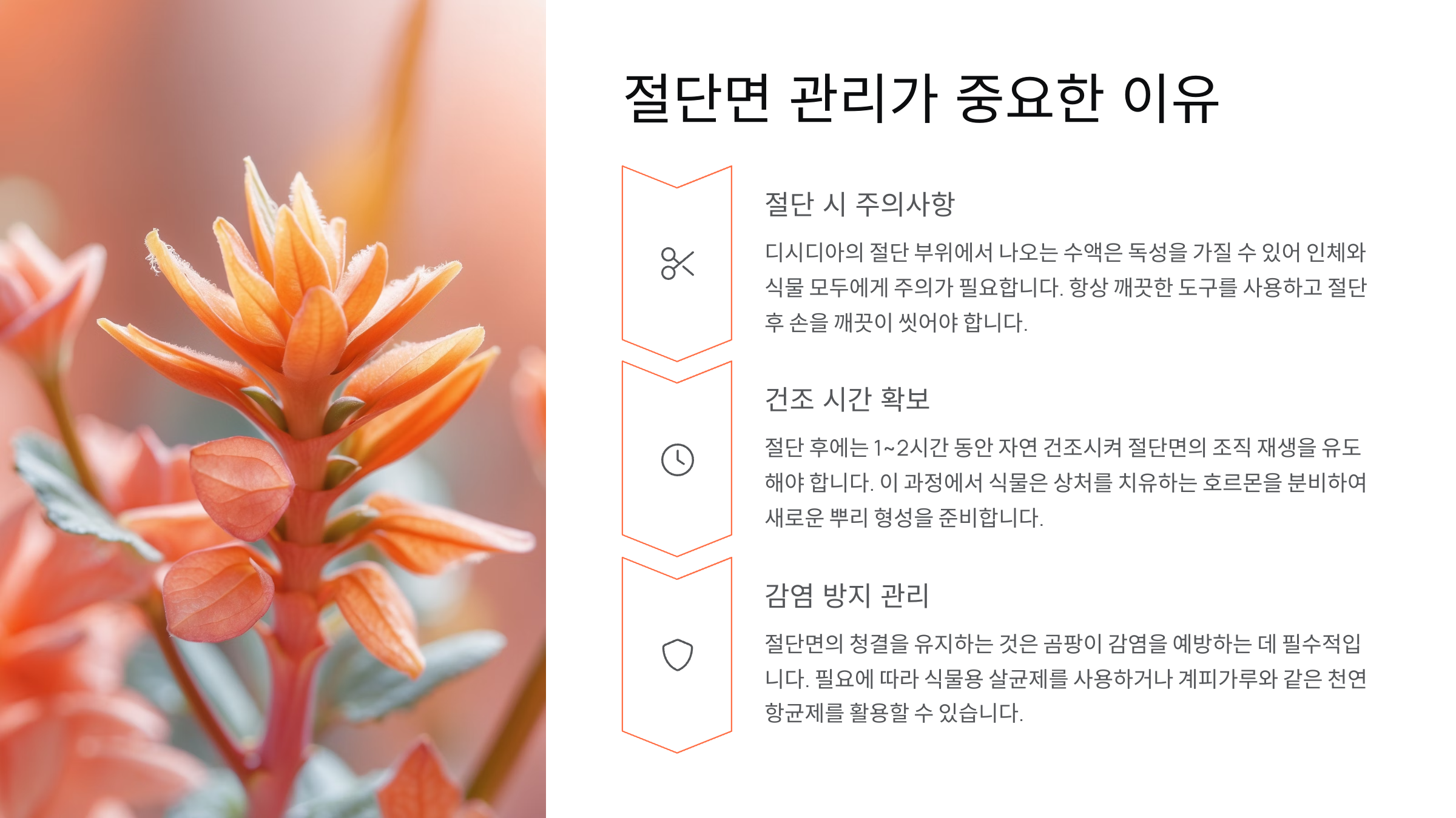 디시디아 번식에서 절단면 관리는 가장 중요하다고 해도 과언이 아니에요. 줄기를 자른 후 바로 물꽂이나 흙꽂이를 하면 절단 부위에 세균이 침투하거나 곰팡이가 발생할 가능성이 높아지기 때문이에요. 특히 습도가 높은 계절에는 더욱 주의가 필요하죠.