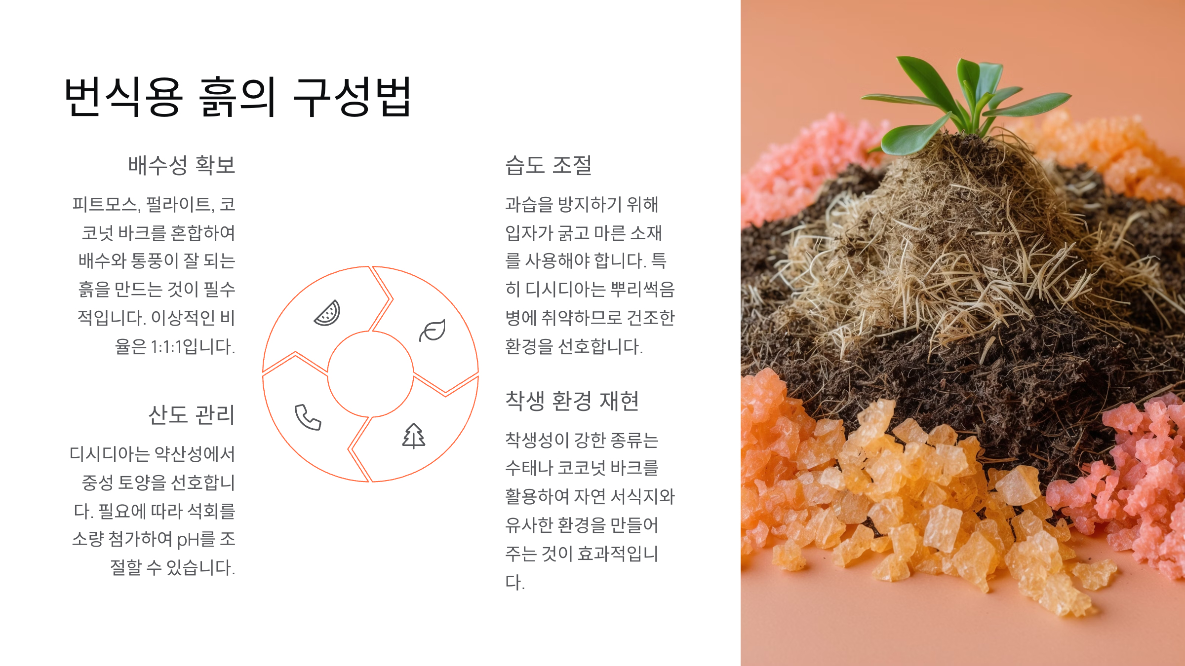 코코피트나 피트모스는 수분을 오래 머금기 때문에 소량만 섞는 것이 좋아요. 초보자라면 아예 빼는 것도 방법이에요. 대신 마사토와 펄라이트를 충분히 넣어서 뿌리 썩음 위험을 최소화하는 게 더 안정적이에요.