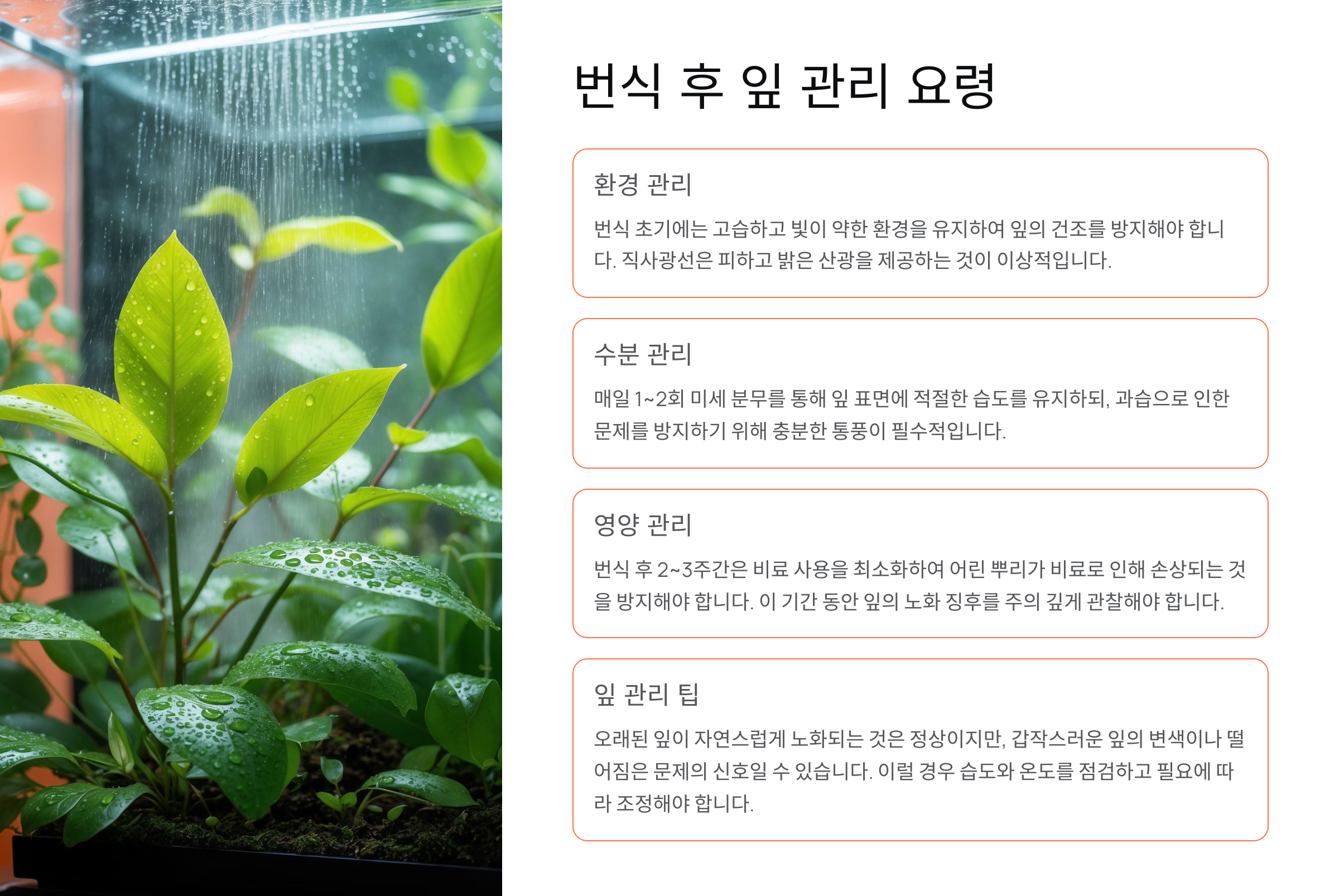 번식 직후에는 잎이 살짝 힘이 없어 보일 수 있어요. 하지만 이것은 일시적인 스트레스로, 3~5일 내에 회복이 되면 건강하게 자리 잡는다는 신호예요. 이 기간 동안은 직사광선을 피하고 밝은 간접광에서 안정시켜주는 게 좋아요.