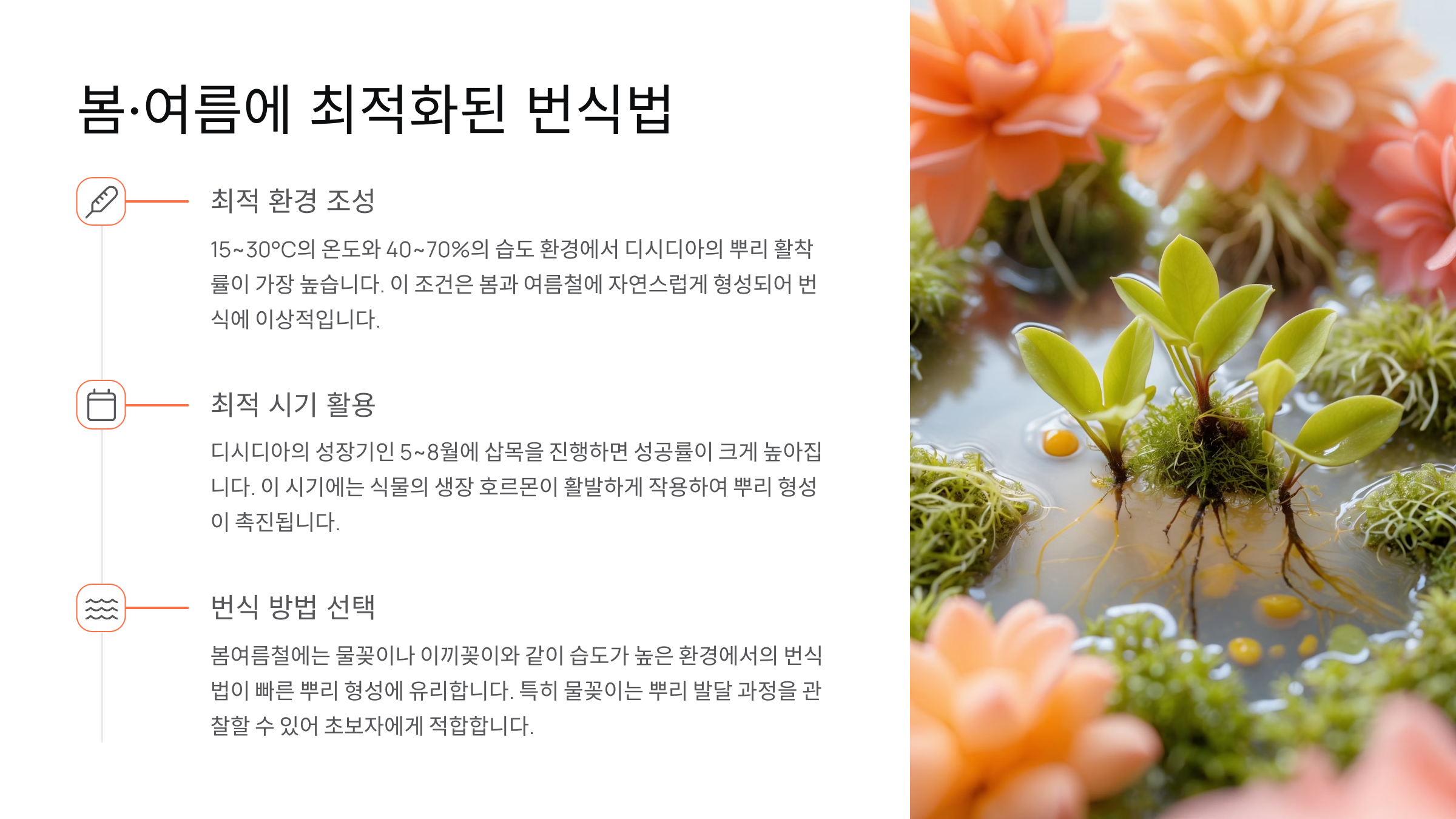 봄철에는 기온이 20도 안팎으로 안정되어 있어서 번식 초기에 스트레스를 덜 받아요. 낮과 밤의 온도 차이도 적기 때문에 번식한 줄기가 외부 자극에 덜 민감하답니다. 특히 4월~6월 사이가 이상적인 시기예요.