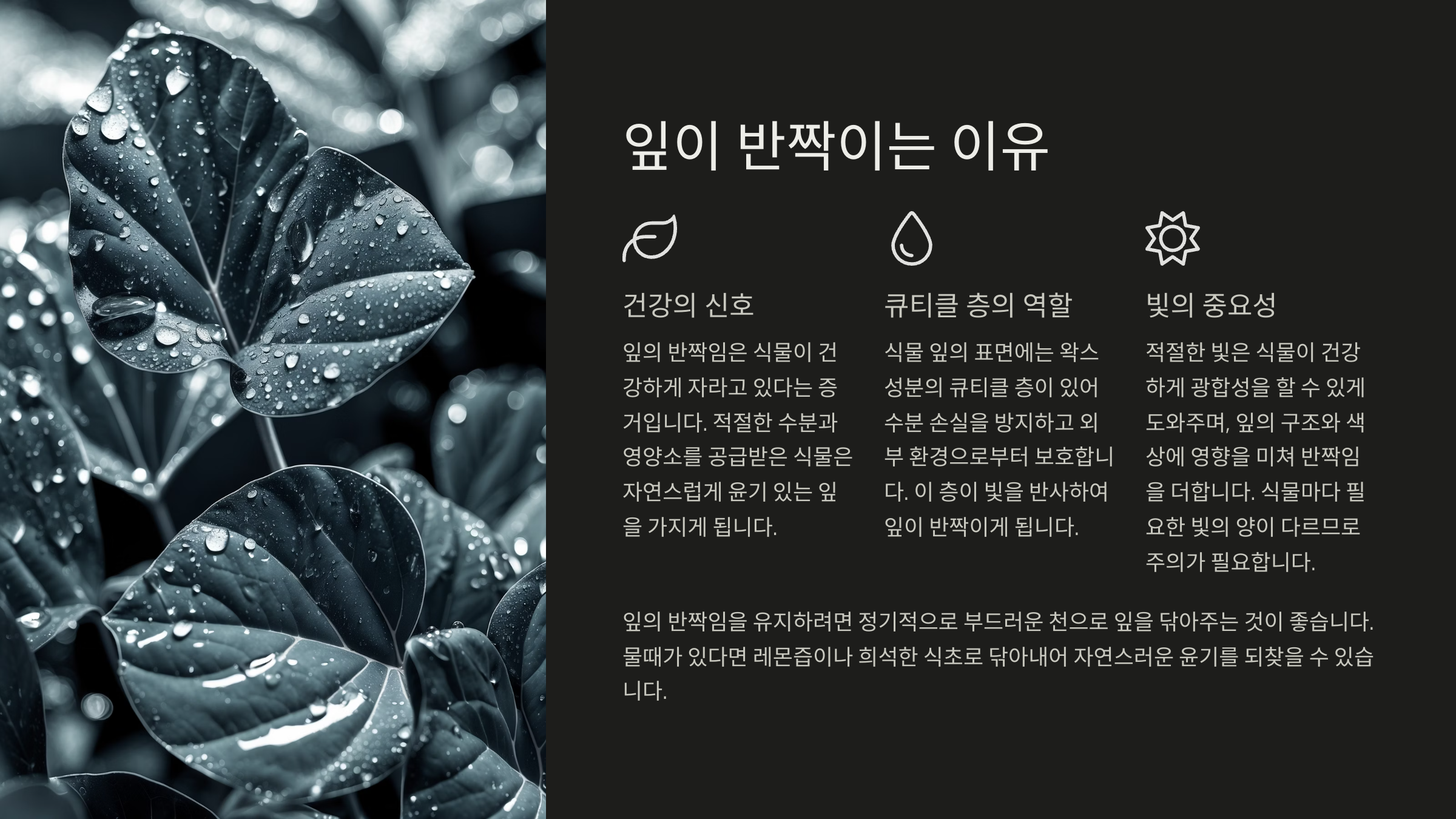반짝이는 잎은 단순한 미적 요소를 넘어, 식물의 건강을 보여주는 지표이기도 해요. 잎에 광택이 있다는 건 식물이 스트레스 없이 잘 자라고 있다는 뜻이에요. 빛, 물, 온도 등이 모두 적절할 때 자연스럽게 잎이 빛나는 거죠. ✨