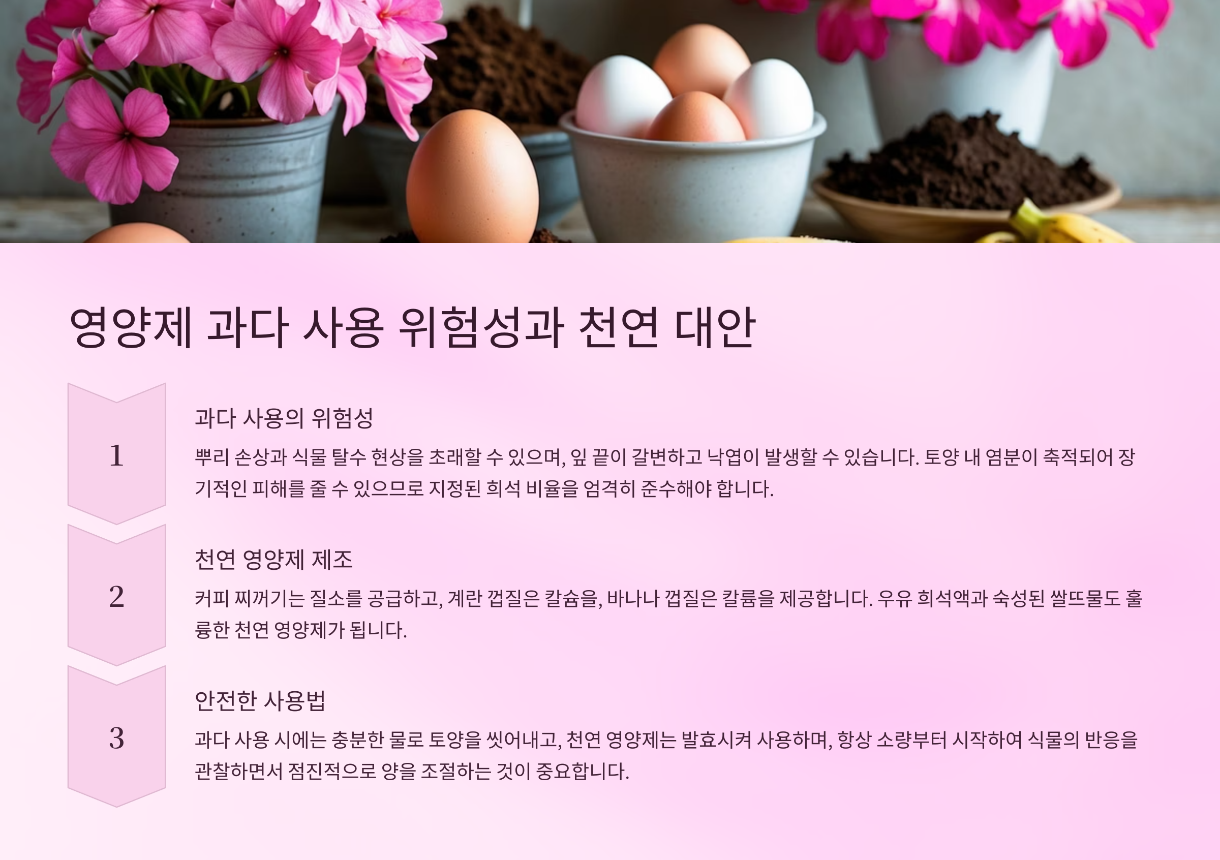 천연 영양제는 자연친화적이고 비용도 절약되지만, 효율이 일정하지 않고 저장성이 낮다는 단점도 있어요. 그래서 화학 영양제와 병행해서 사용하는 걸 추천해요. 식물에게도 균형 잡힌 식단이 중요하니까요! 🌻