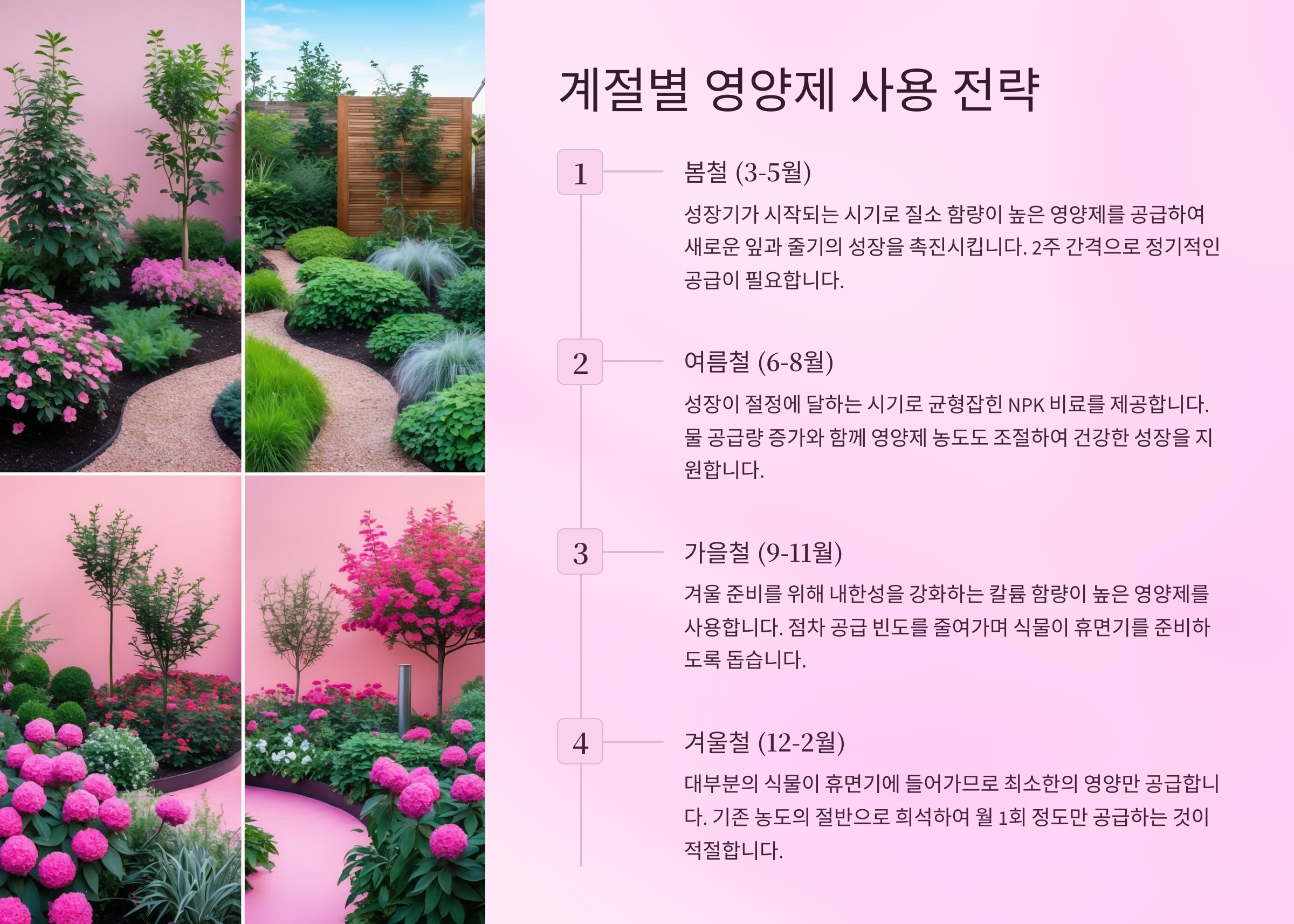| 활용 추천 시기 | 성장기, 병충해 후 | 여름, 관리 어려울 때 |