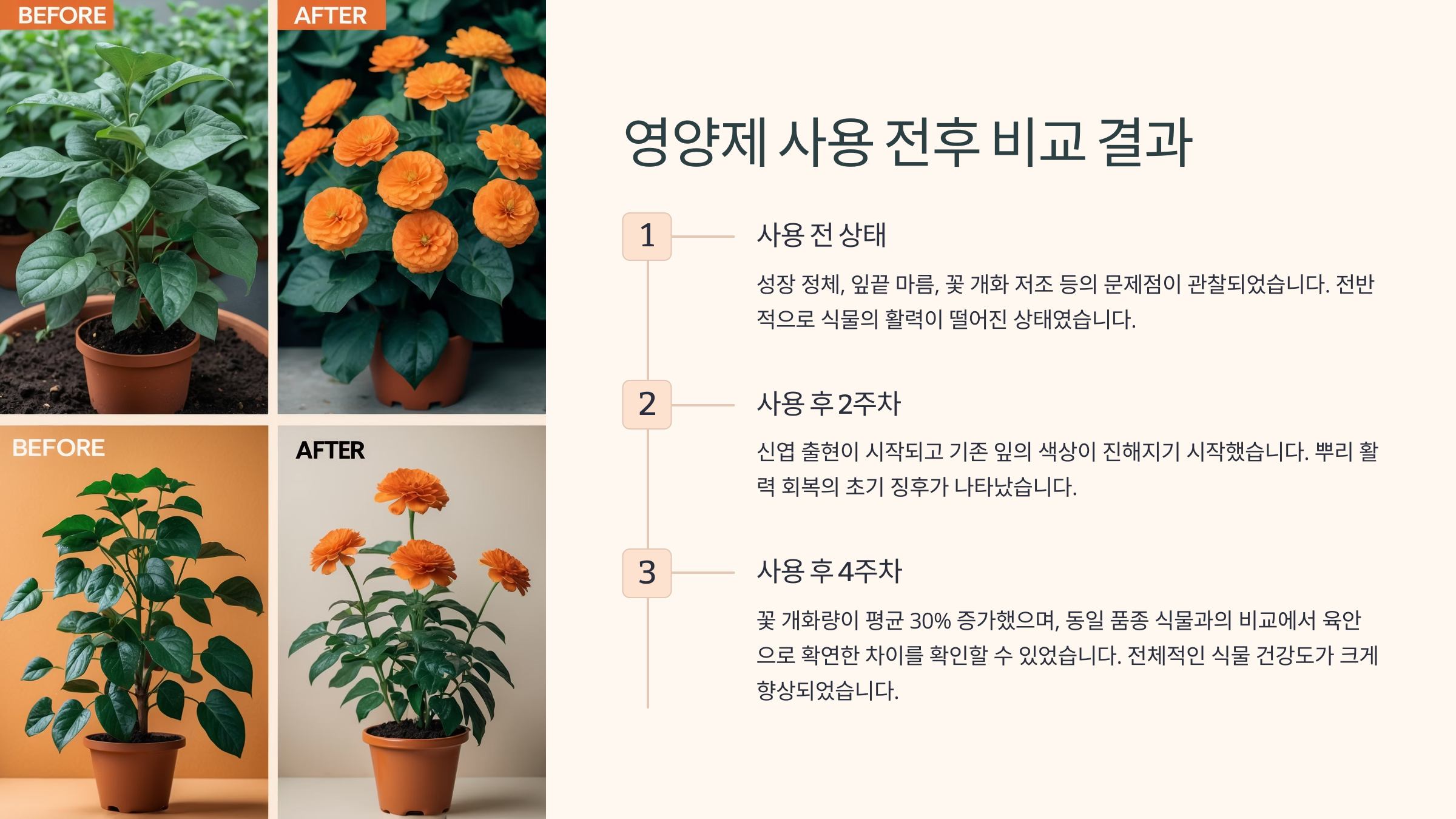 영양제 전후를 비교할 때는 1~2주 단위로 사진을 찍어두는 것도 좋은 방법이에요. 육안으로 식물의 변화를 추적하고, 효과가 있는지 없는지 스스로 판단할 수 있어요. 영양제 선택에 실패했는지 여부도 파악하기 쉬워지죠.