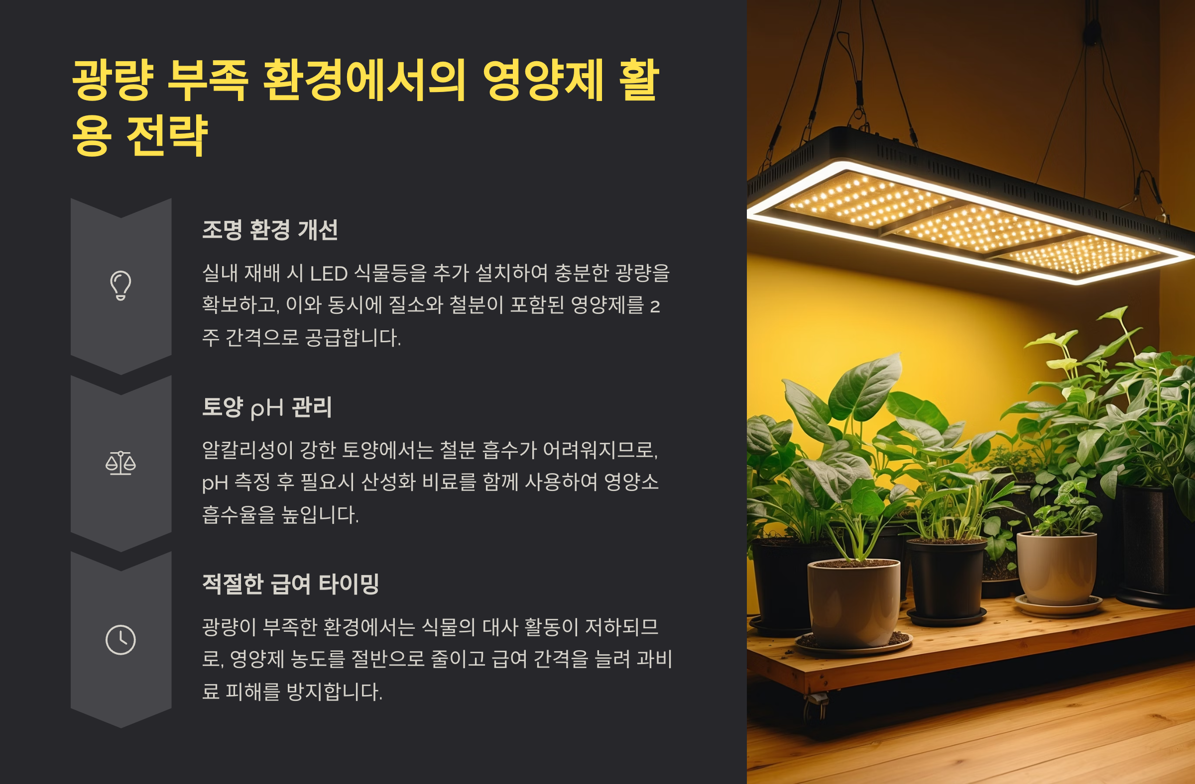| 햇빛 부족 | 철, 마그네슘 중심 액상형 | 주 1회 엽면시비 병행 |
