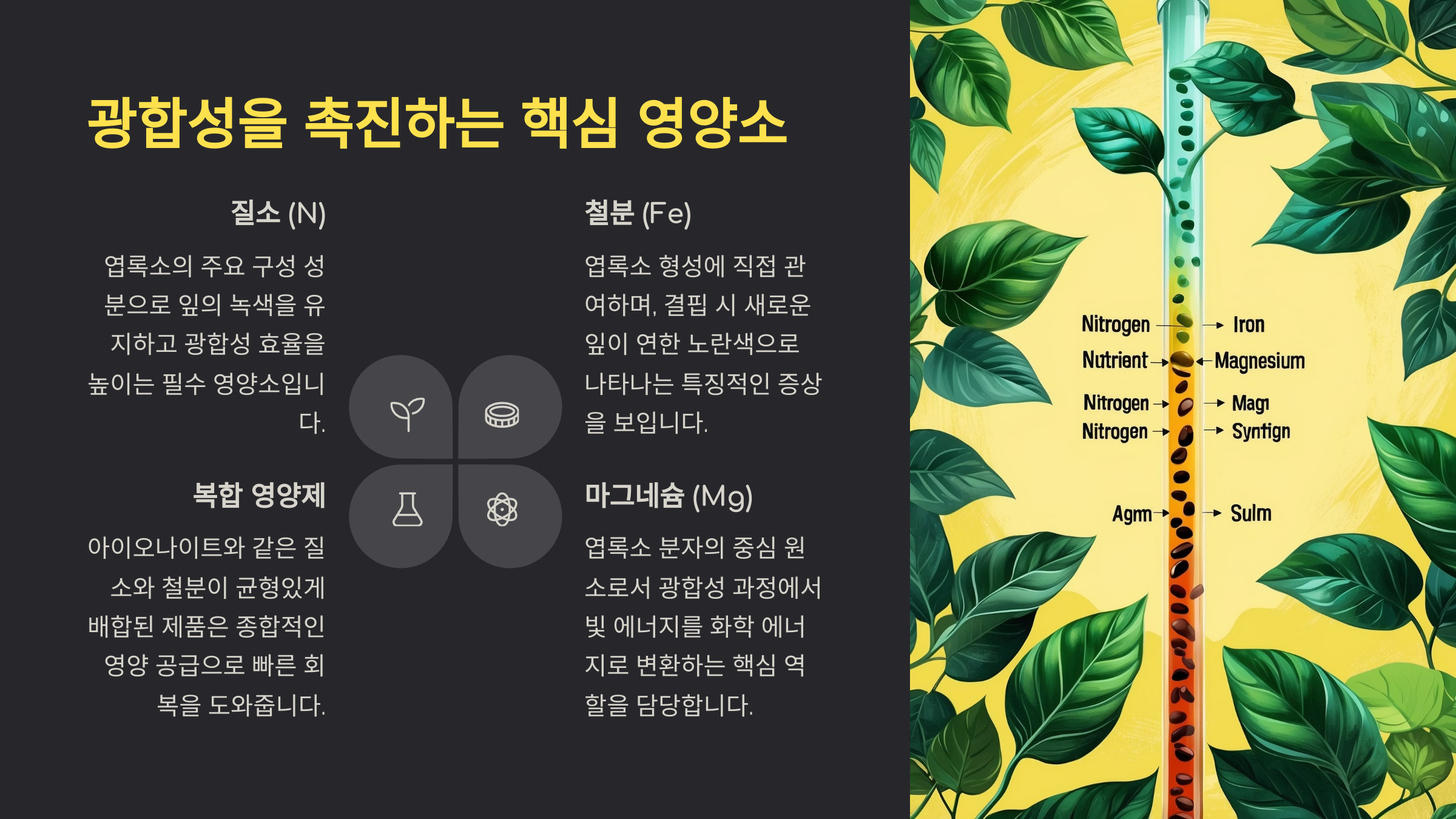 내부에 광합성 관련 영양소가 부족하면 빛을 흡수해도 에너지로 전환하지 못해요. 이럴 때 꼭 필요한 영양소들이 있어요.