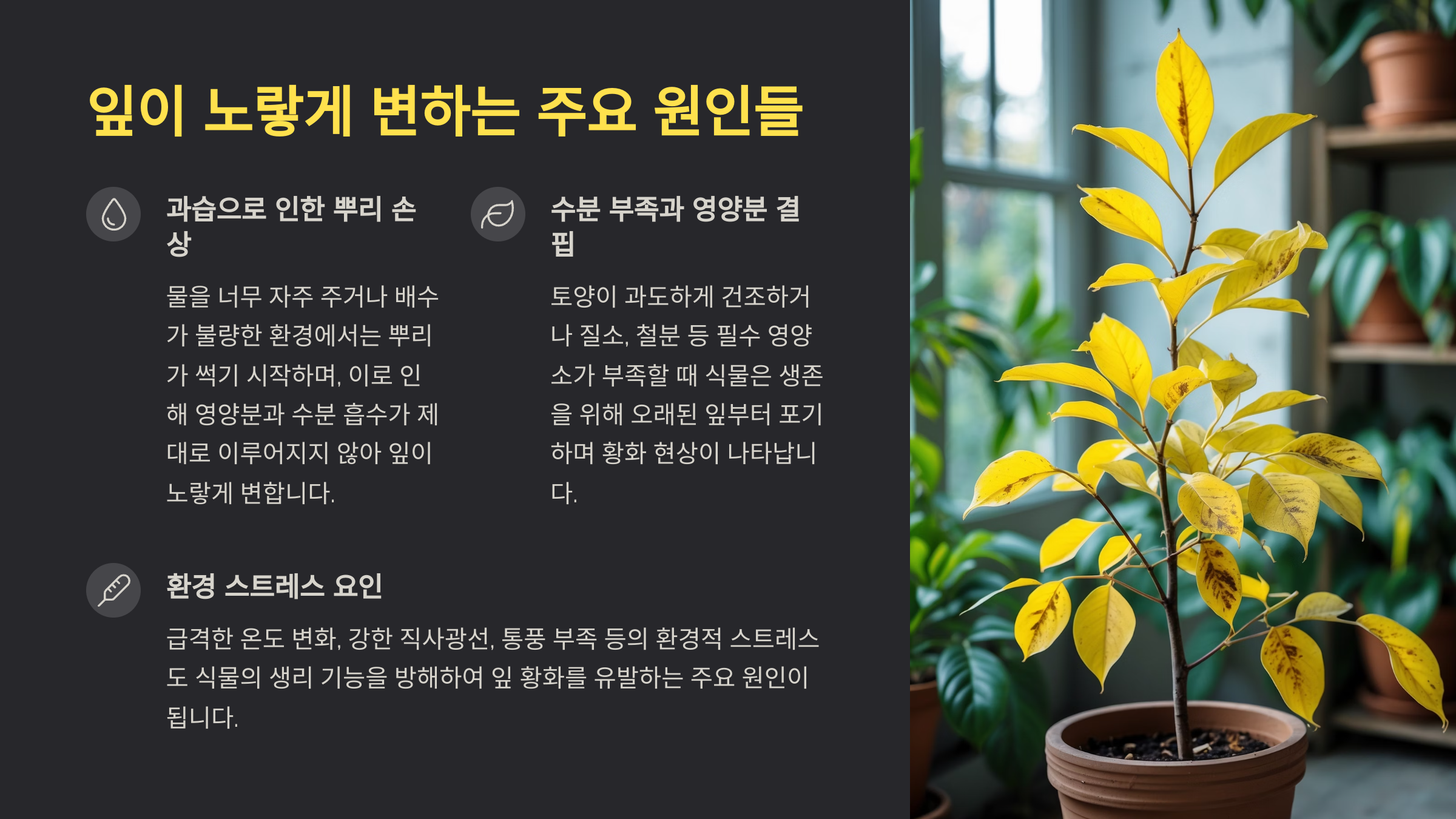 식물의 잎이 노랗게 변할 때 가장 먼저 떠오르는 건 물 부족일 거예요. 하지만 실제로는 과습, 영양 결핍, 빛 부족, 뿌리 문제 등 다양한 원인이 있어요. 그래서 단순히 노란 잎 하나만 보고 원인을 단정 짓는 건 위험해요.