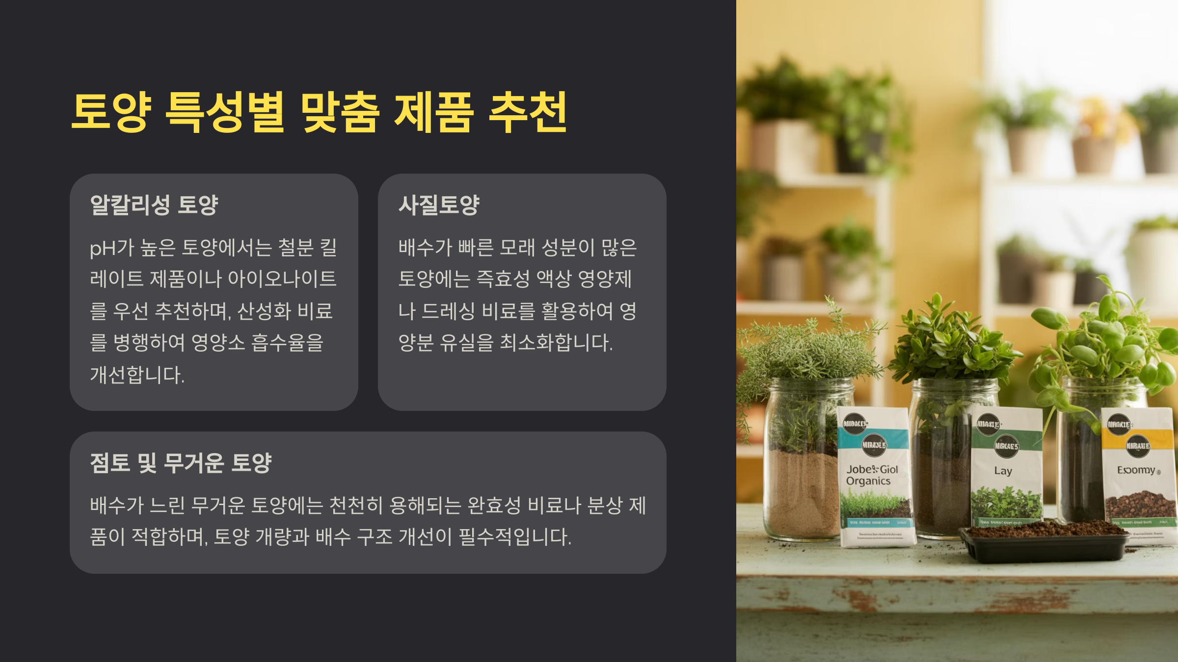 이렇게 4단계를 차근히 실행하면 대부분의 잎 문제는 며칠 내에 반응을 보여요. 특히 ‘죽은 잎 제거’만 해줘도 전체적인 상태가 훨씬 안정돼요. 이제 다음은 ‘토양 상태에 따른 추천 제품’을 알려드릴게요. 흙에 따라 영양제가 달라져야 하거든요.