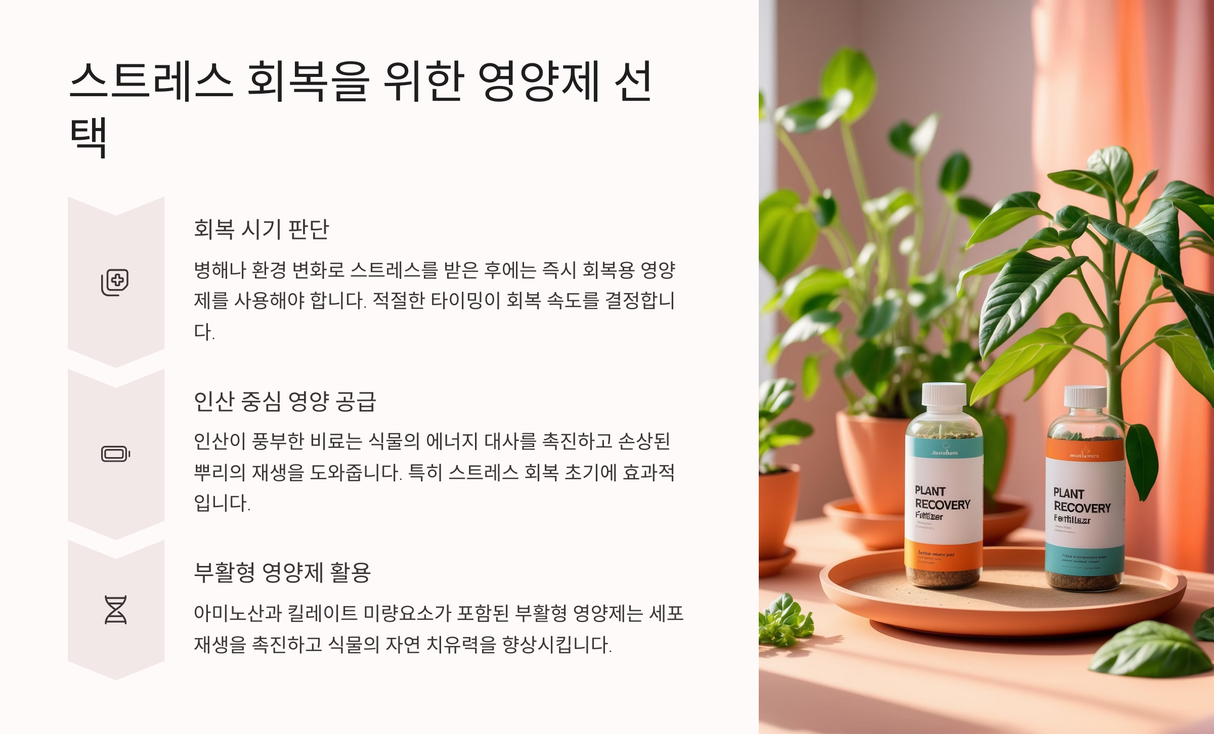 1주일이 지난 뒤 식물 상태가 안정되면, 저농도의 회복용 영양제를 물에 희석해 소량씩 주는 걸 시작해요. 해조 추출물이나 아미노산, 유기산 등이 포함된 제품이 좋아요. 이 시기에는 질소보다는 마그네슘, 칼슘, 미량 원소가 중심이 된 제품이 적합해요.