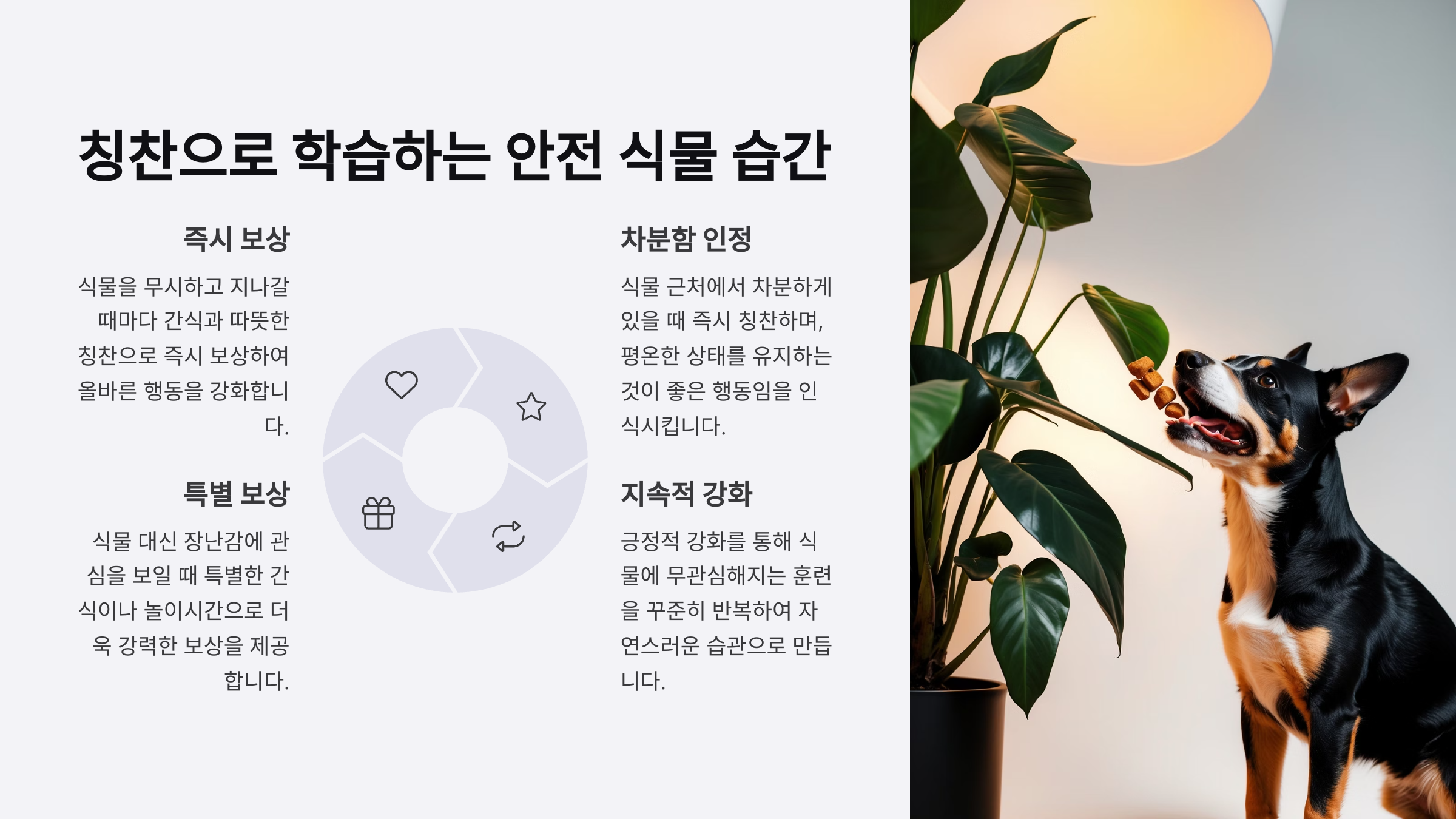 | 식물 앞에서 얌전히 있음 | 즉시 보상 제공 | 간식 + 칭찬 |