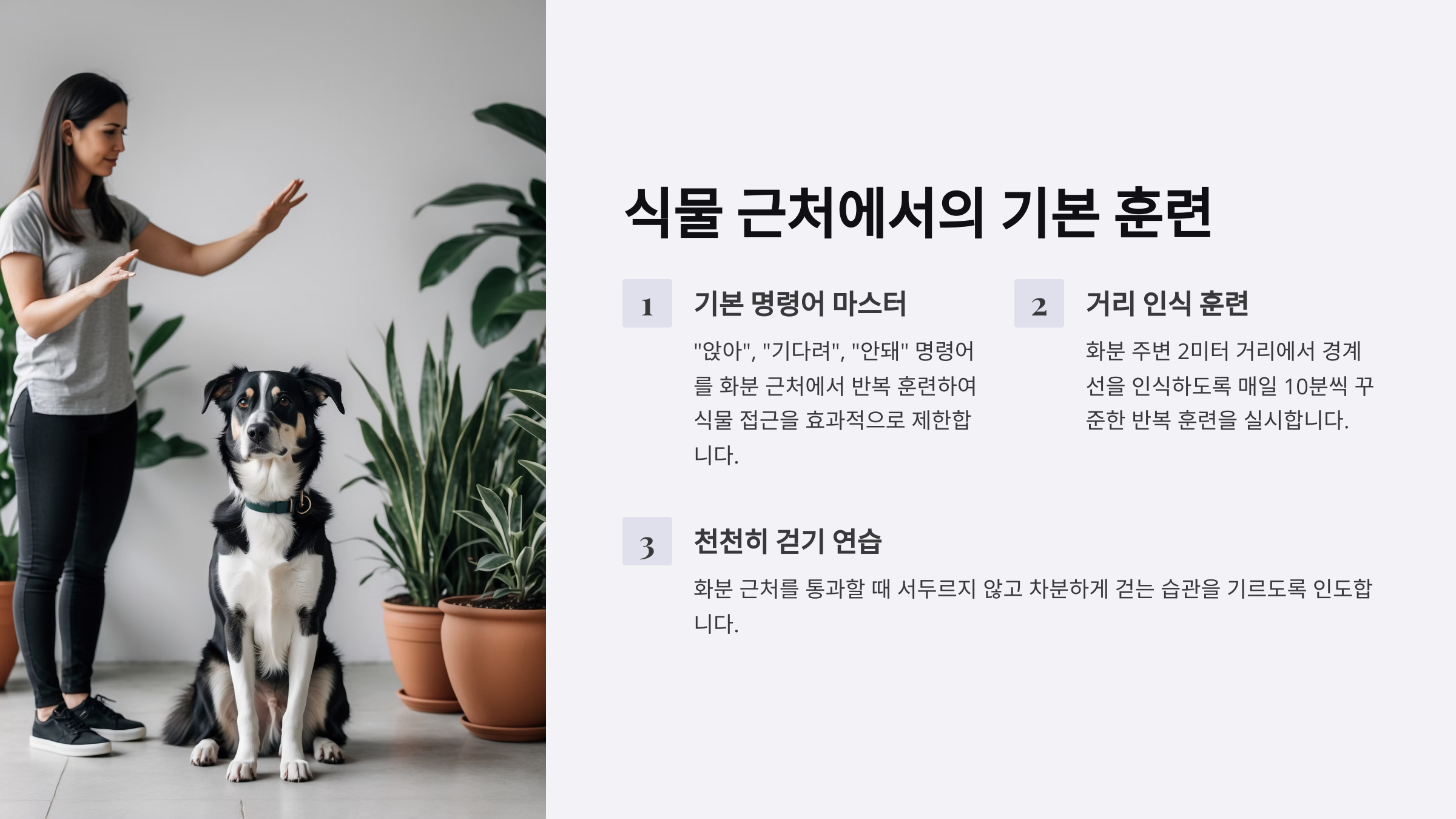 식물 앞에만 가면 ‘앉아’와 ‘기다려’ 훈련을 반복하는 것도 좋아요. 그러면 강아지는 그 공간이 ‘가만히 있어야 하는 장소’로 인식하게 돼요. 반복은 강아지 훈련의 핵심이니까요!
