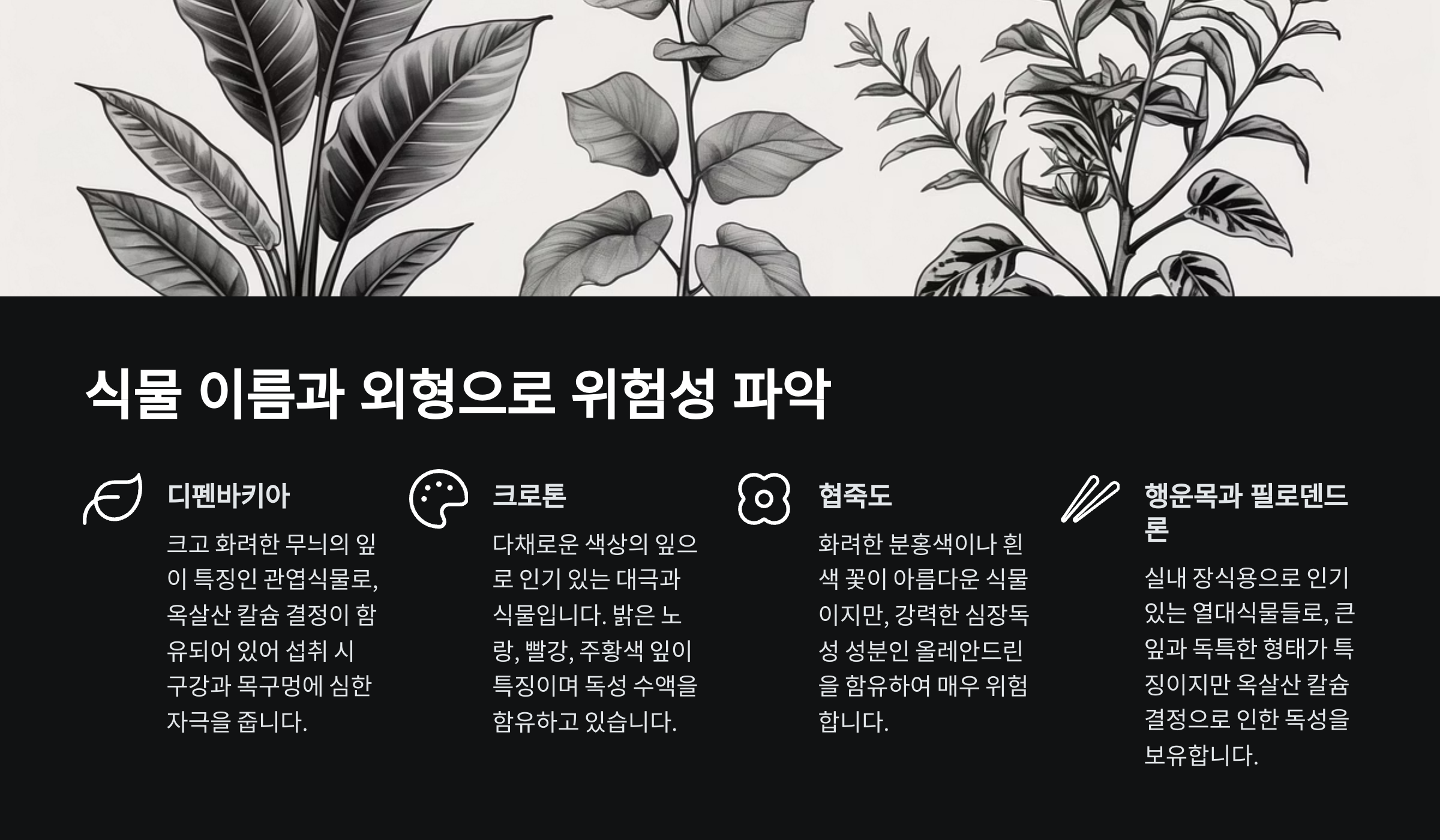 | 외형 특징 | 주의 식물 예시 | 위험 요인 |