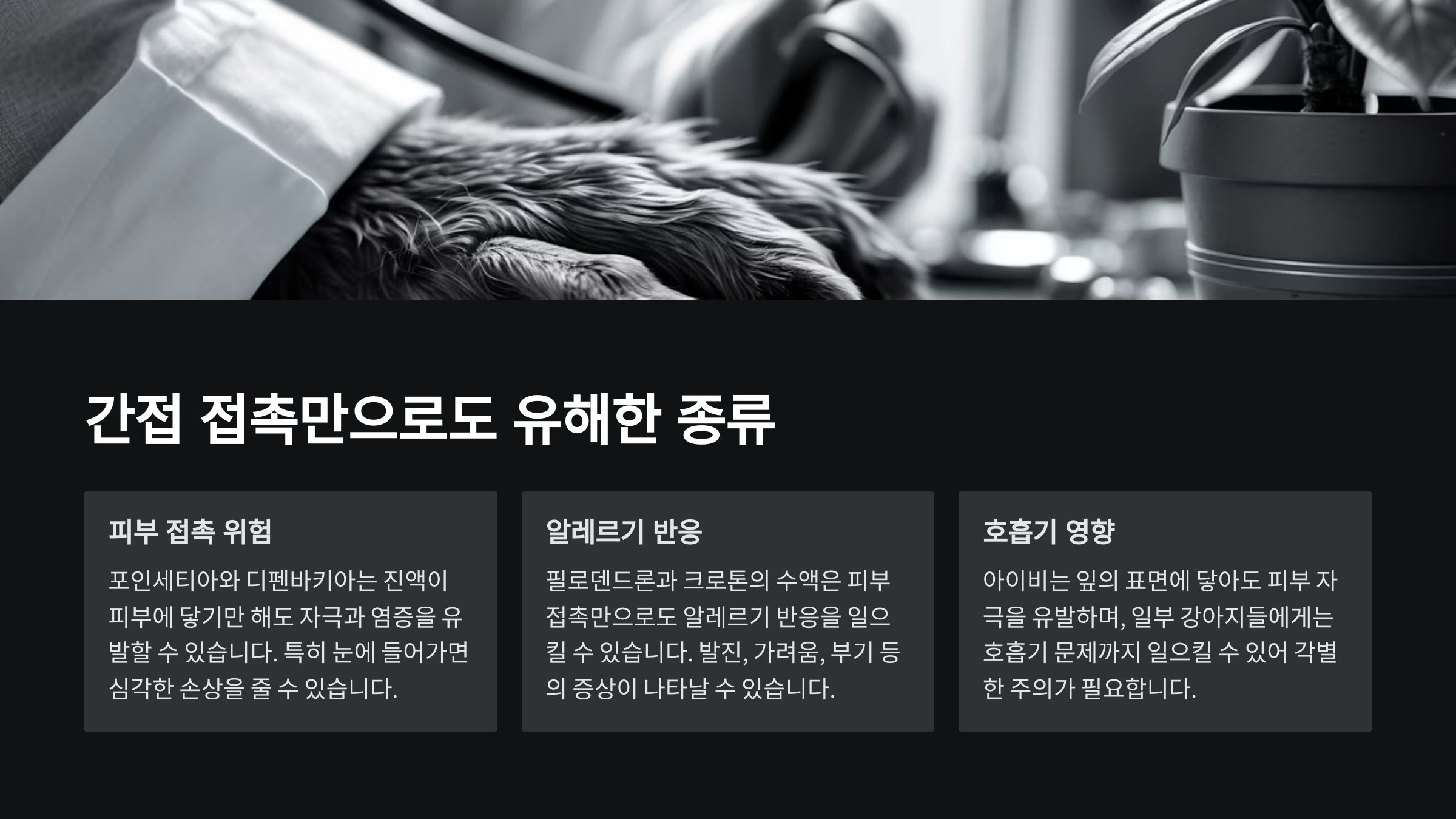 이제 다음으로는, 먹지 않아도 접촉만으로 유해할 수 있는 식물들에 대해 알아볼게요. 피부 자극, 알레르기, 눈물 흘림 같은 반응을 유발하는 종류도 있어서 더욱 주의가 필요하거든요! 🌱👃🐶