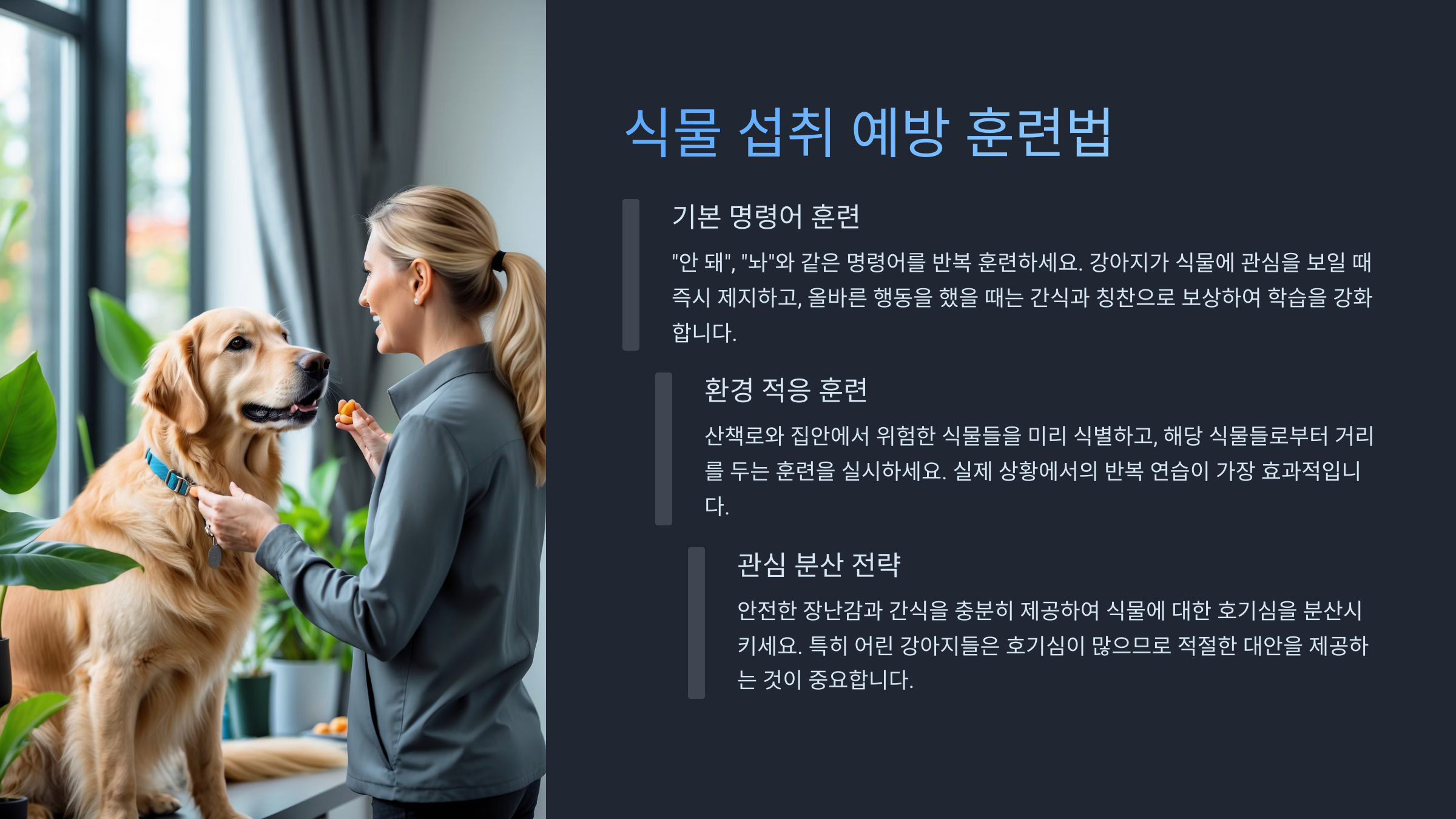 응급 대응은 침착함이 가장 중요해요. 당황하지 않고, 지금 어떤 정보가 필요한지 판단하고 병원에 빠르게 전달하는 것이 강아지를 지키는 가장 좋은 방법이에요. 다음은 이런 상황을 예방할 수 있는 ‘식물 섭취 예방 훈련법’을 알려드릴게요.