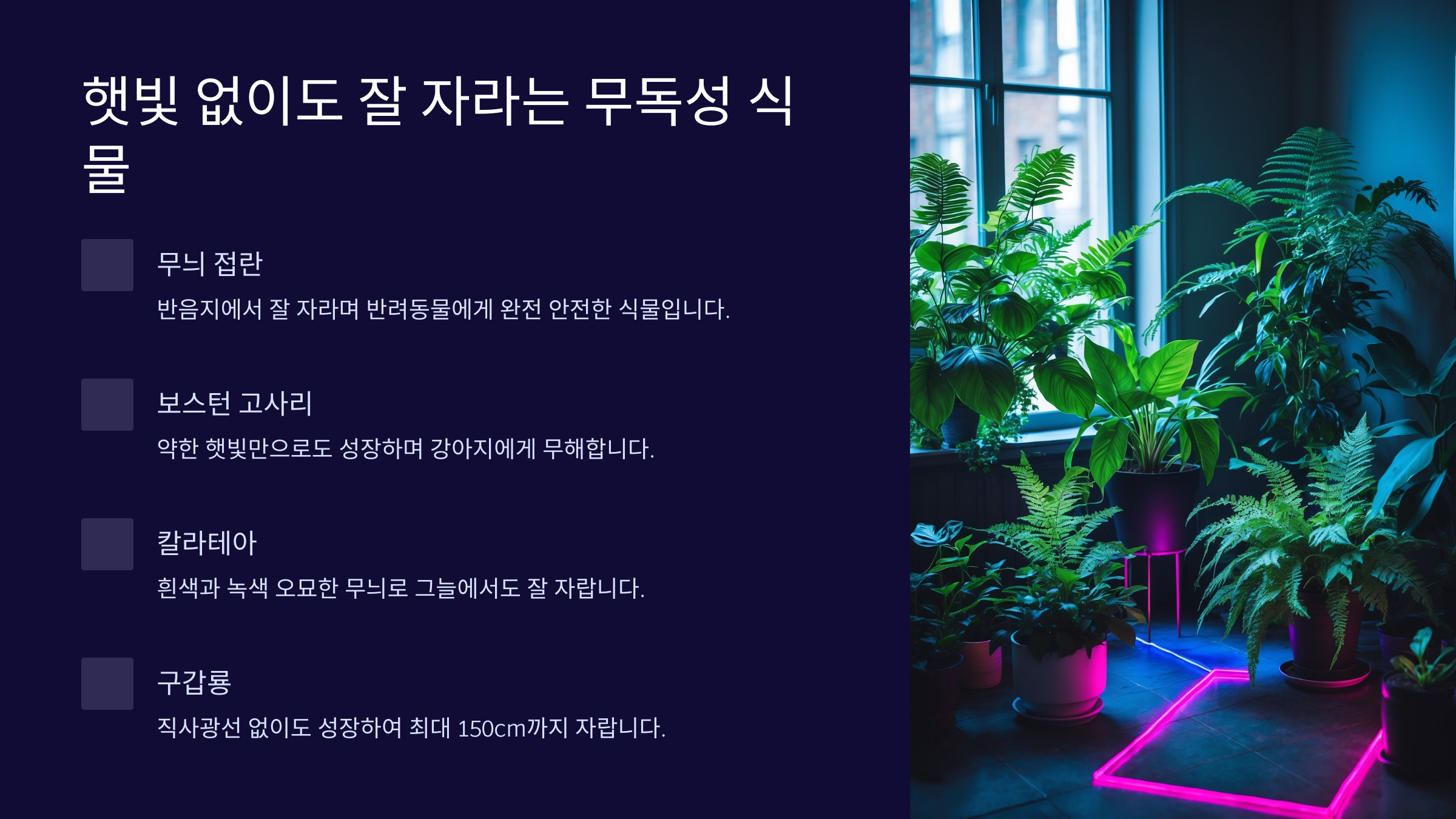 | 칼라데아 | 화려한 잎, 무독성 | 약한 빛에도 생존 가능 |