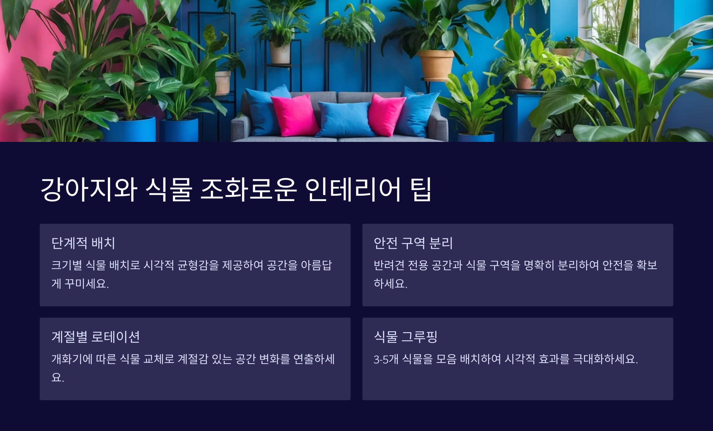 그럼 이제 마지막으로, 강아지와 식물을 함께 배치할 때 감성적인 인테리어 효과까지 챙기는 팁을 알려드릴게요. 조화로운 집 꾸미기, 함께 해봐요! 🏡🌿🐾