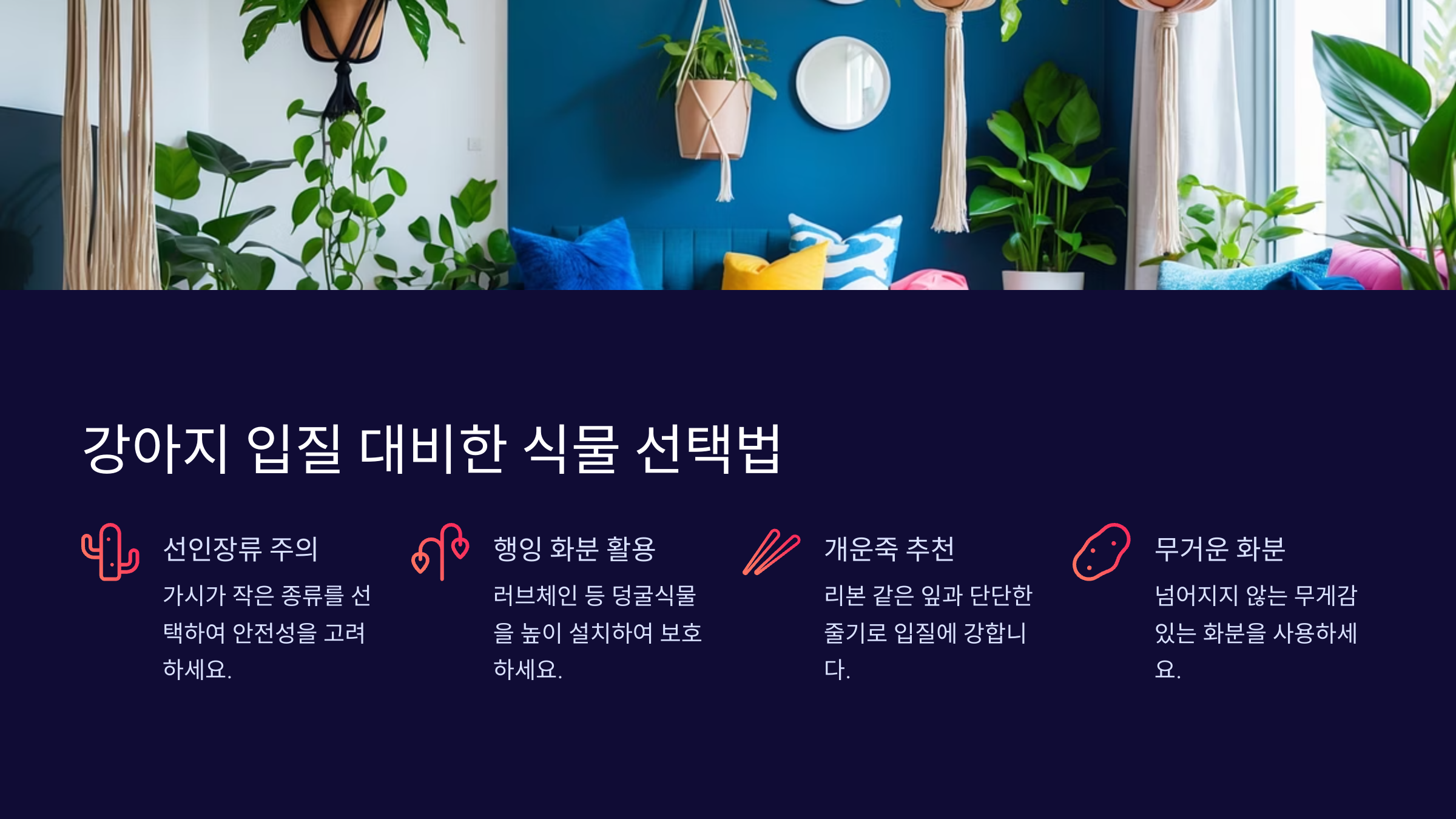 이런 식물들은 자연광이 거의 없는 공간에서도 충분히 자랄 수 있고, 강아지에게 위험하지 않기 때문에 반려가정에 적극 추천할 수 있어요. 물 주는 간격만 잘 지켜주면 초보자도 무리 없이 키울 수 있답니다. 😊