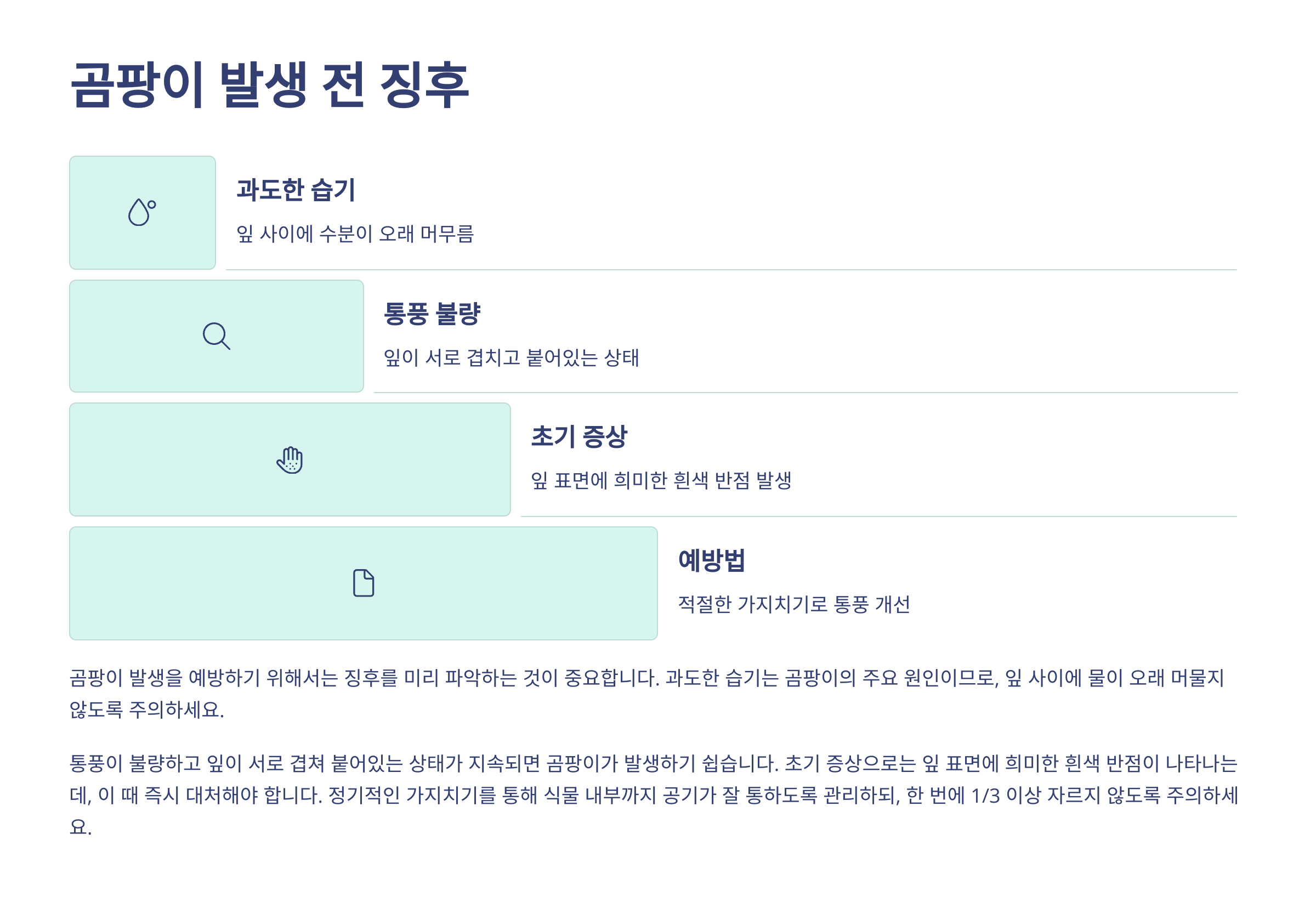 | 흙 표면에 하얀 가루 | 곰팡이균 초기 발현 | 겉흙 제거 + 햇빛 노출 |
