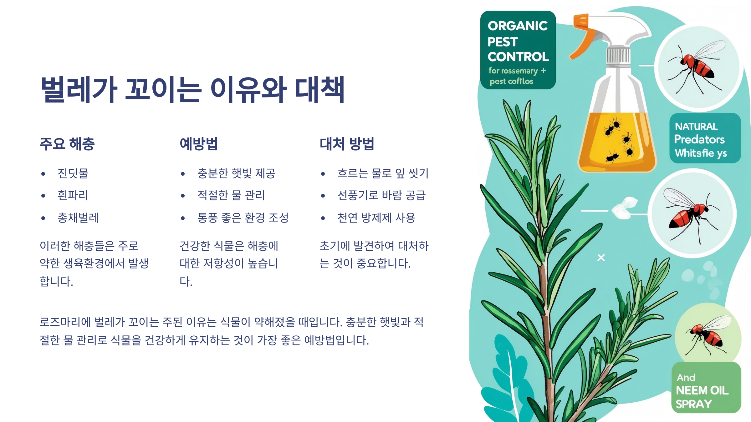 여기서는 로즈마리 번식 이후 꼭 확인해야 할 병충해 예방 요령부터, 자연 친화적인 방제 방법, 벌레가 생기는 이유와 해결 방법까지 하나하나 친절하게 알려줄게요 🌿