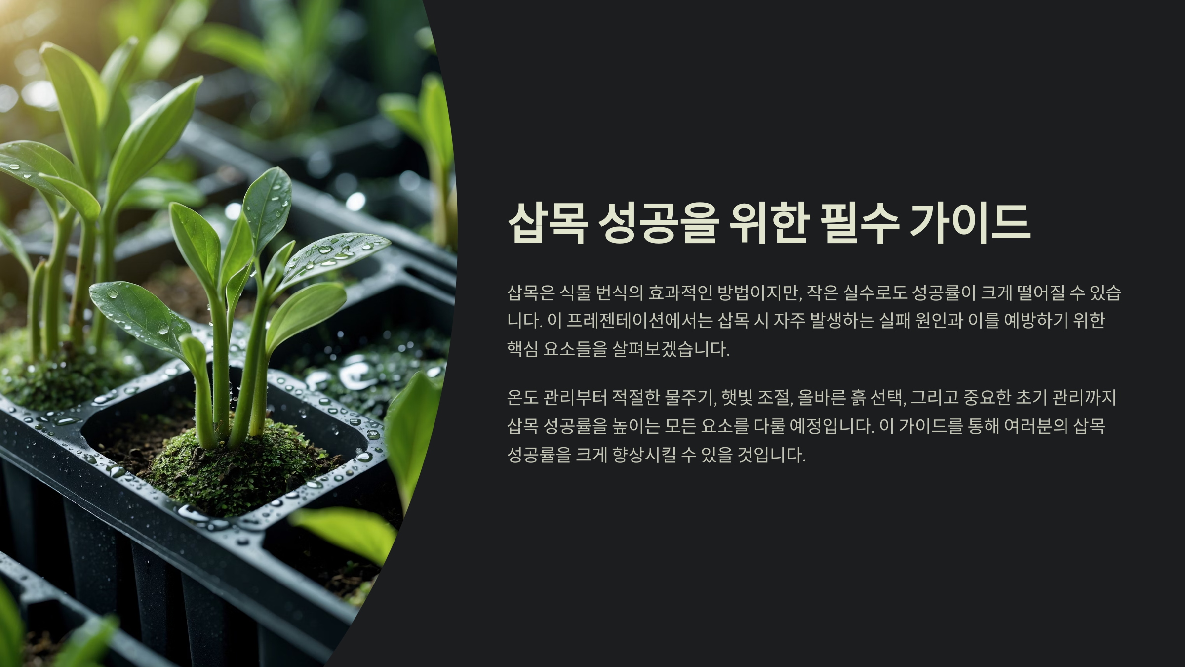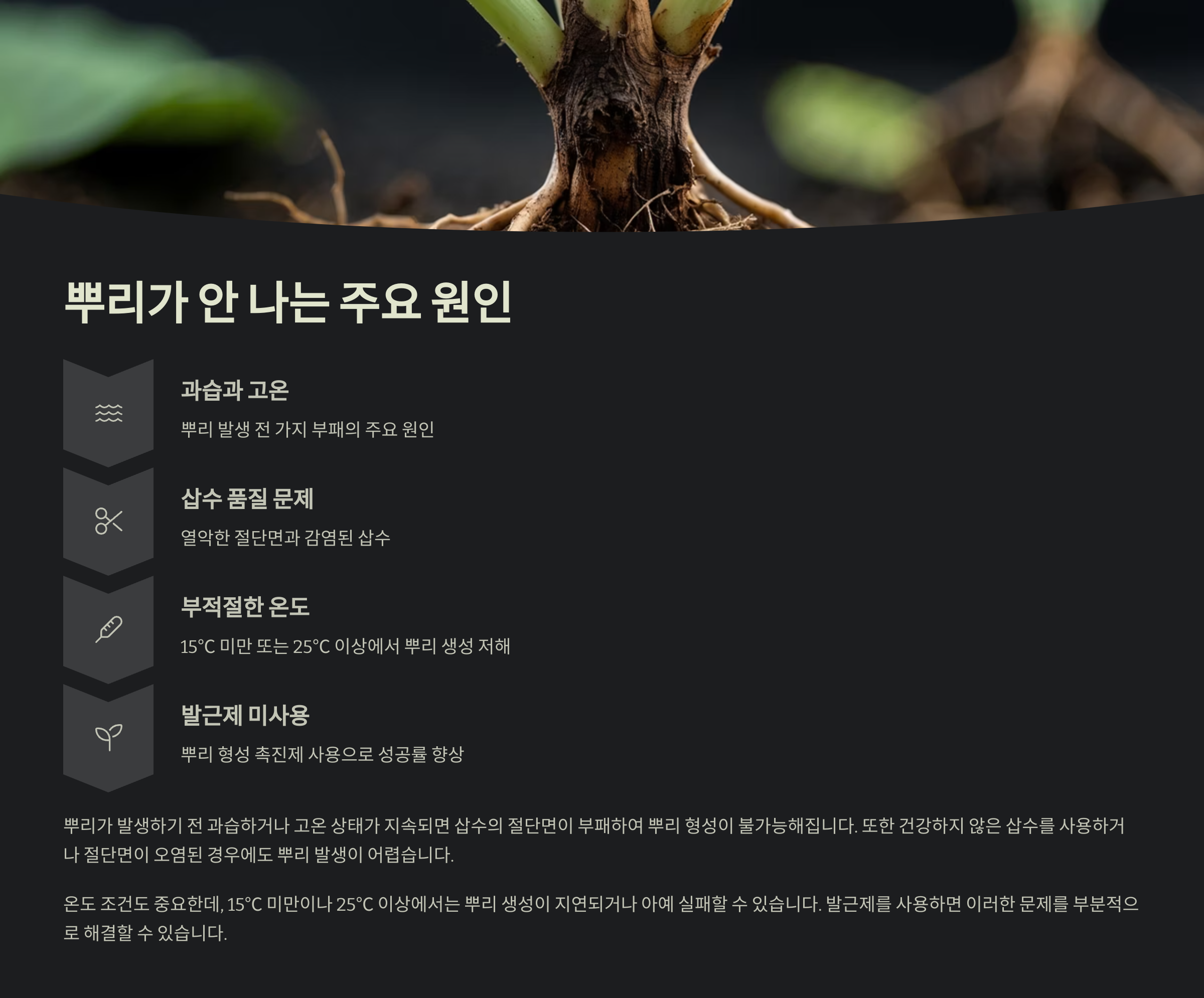 또한, '기온이 낮은 환경'에서는 뿌리 활성이 떨어지기 때문에 발근이 지연되거나 멈추게 돼요. 봄~초여름, 또는 가을 초반이 삽목에 가장 알맞은 계절이에요.