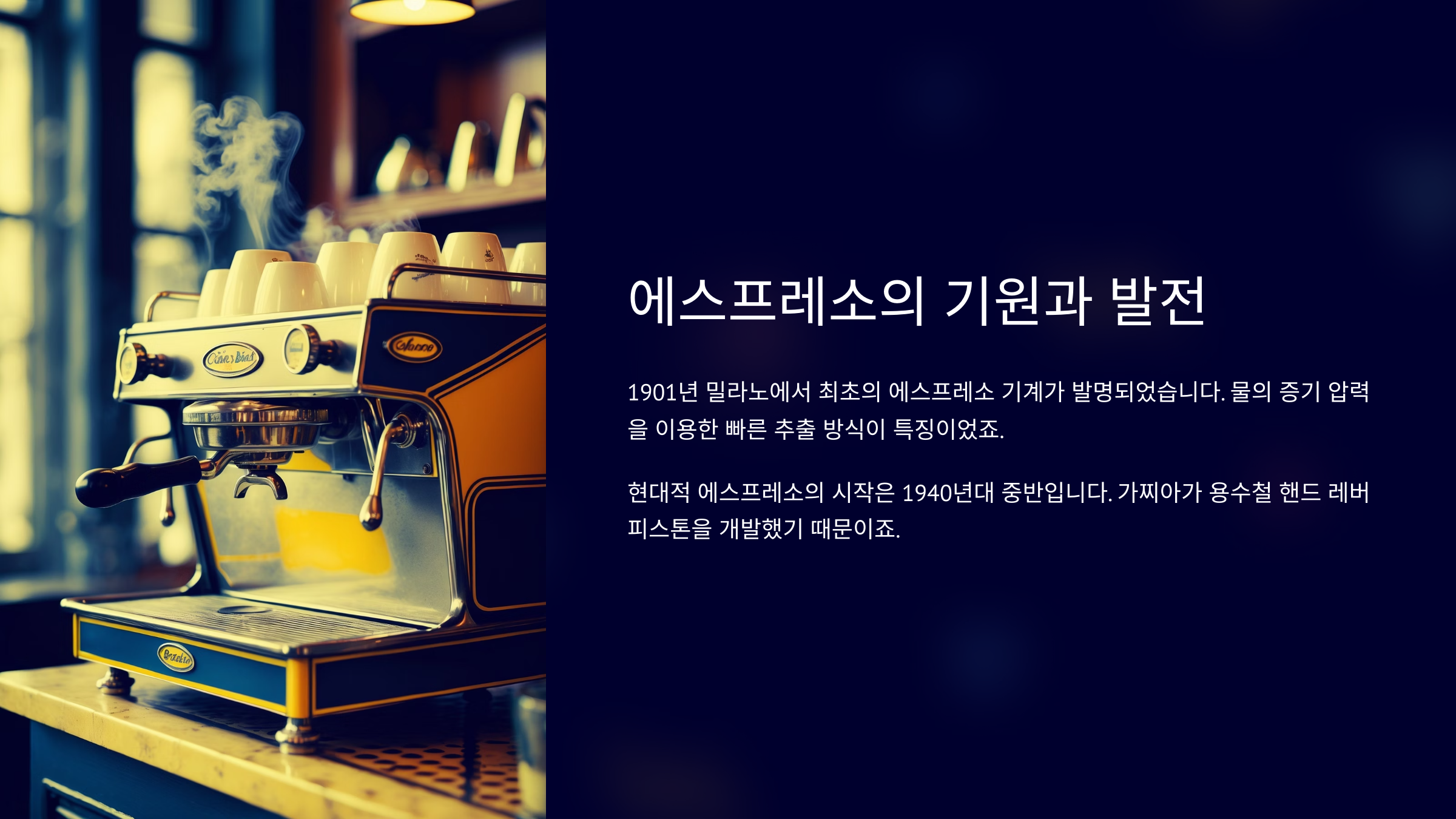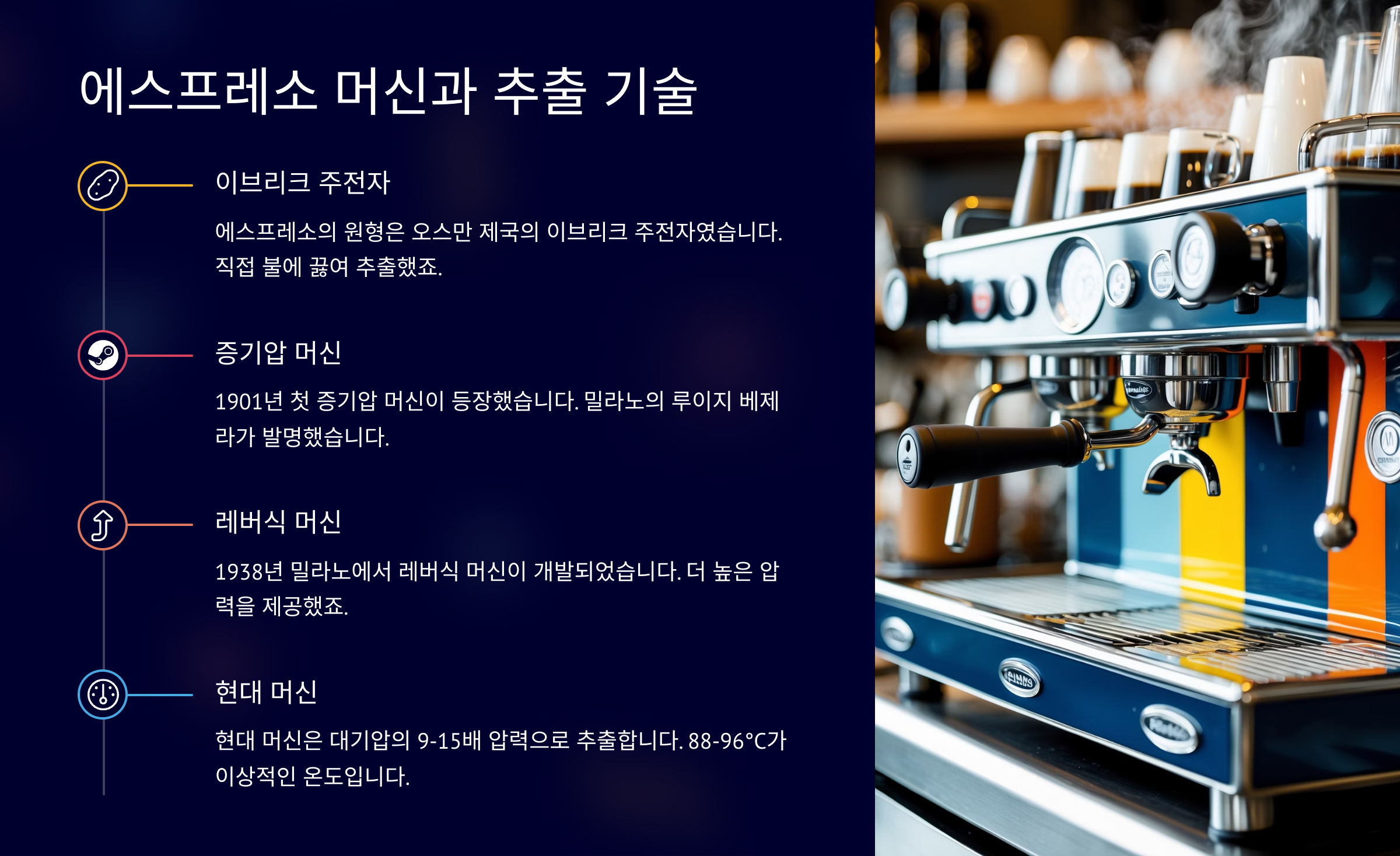 | 1947 | 레버형 머신 개발 | 압력 향상 및 크레마 탄생 |