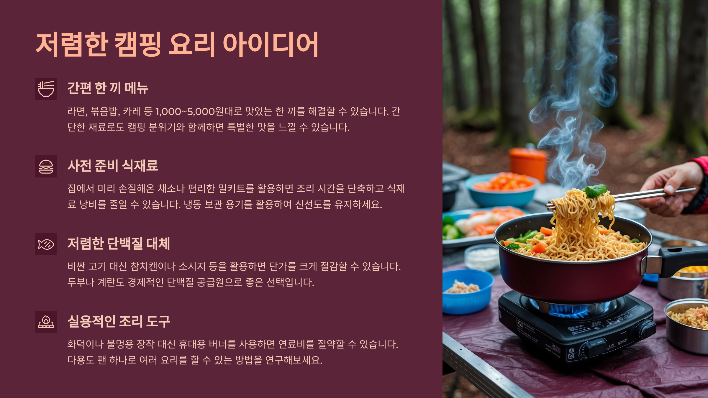예산 절약에 탁월한 메뉴로는 '김치볶음밥', '통조림 참치비빔밥', '라면전골', '은박지 삼겹살구이'가 있어요. 전기 없이도 조리가 가능하고, 아이들도 좋아하는 메뉴라 가족 캠핑에도 잘 어울려요.