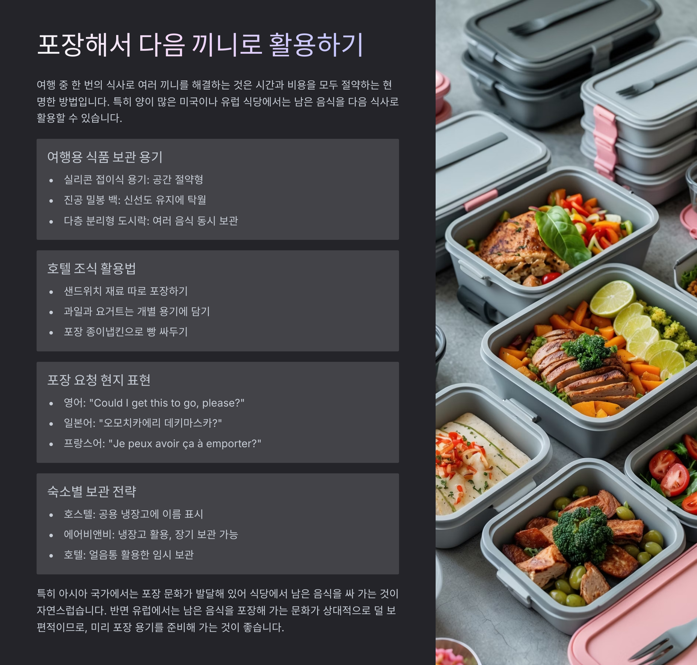 여행 중 식비를 줄이기 위한 꿀팁 중 하나는 ‘한 번에 많이 사서, 나눠 먹기’ 전략이에요. 특히 식당에서 양이 많거나, 음식이 남았을 경우 과감히 포장해서 다음 끼니로 활용하면 경제적이면서도 편리하답니다. 현지에서는 이를 자연스럽게 여기는 문화도 많아요.