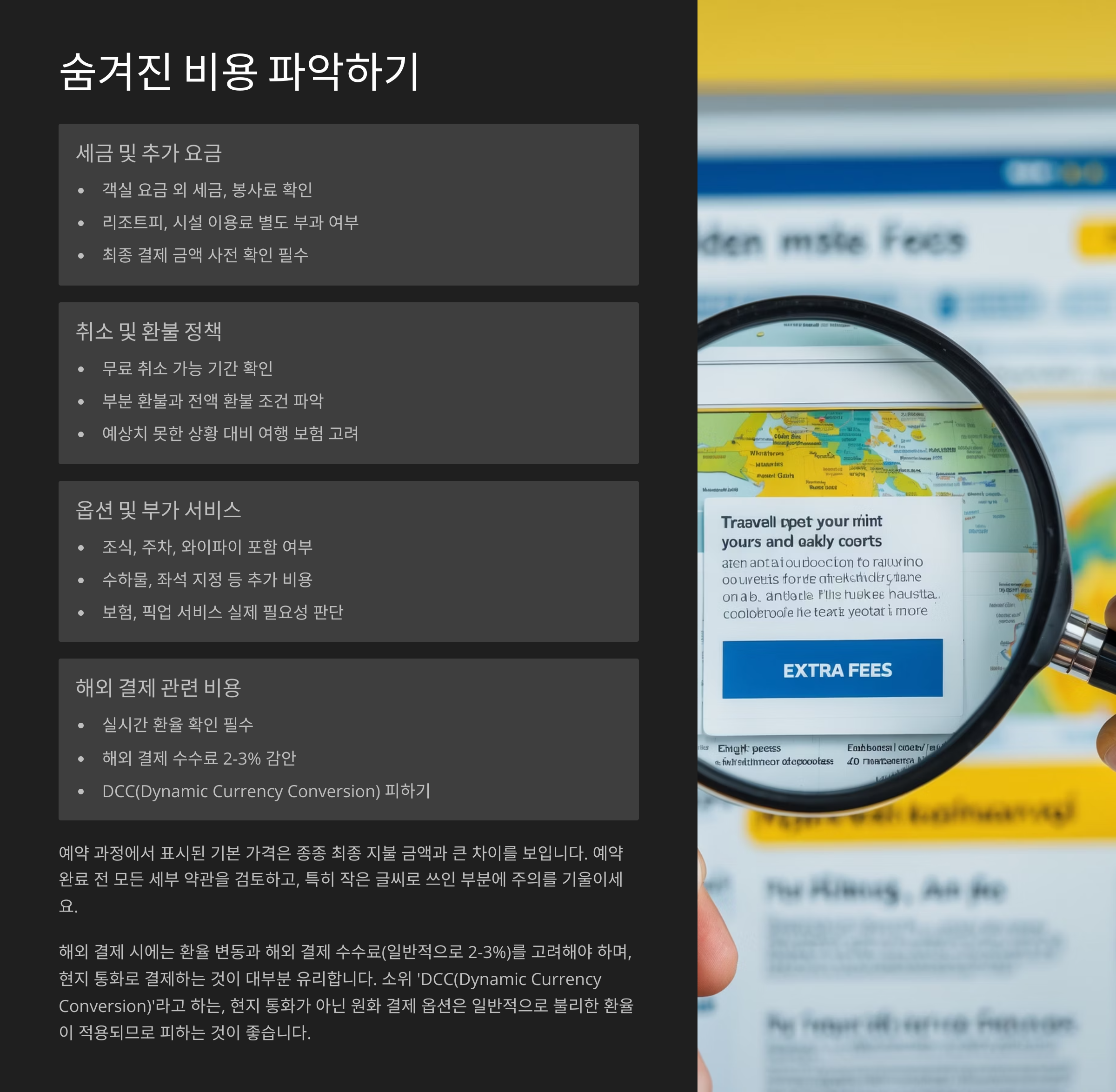 숙소에서는 체크아웃 청소비, 추가 인원 요금, 조식 포함 여부도 체크해야 해요. 처음엔 싸 보였지만 체크인 후에 청소비로 하루치 요금이 추가되는 숙소도 있어요. 특히 에어비앤비 같은 공유숙박은 이런 부가 비용이 많답니다.