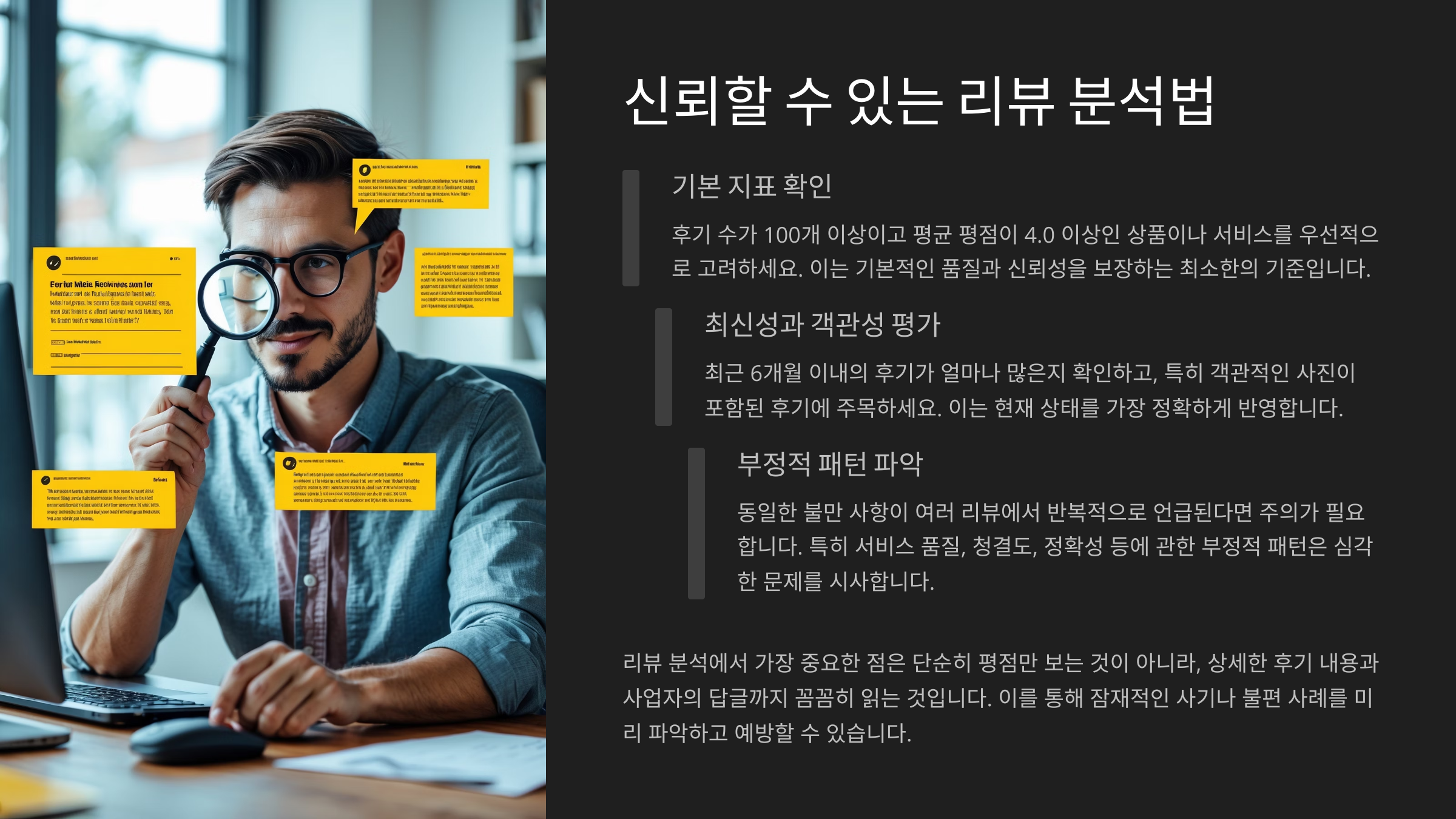 리뷰를 볼 때 가장 먼저 확인할 것은 '날짜'예요. 너무 오래된 후기는 시설이 바뀌었을 가능성이 있기 때문에 최근 6개월 이내의 후기를 중심으로 보는 게 좋아요. 또 평점이 지나치게 높은 곳은 의심해봐야 해요. 특히 후기가 10개 이하인데 평점이 10점이라면 신중하게 판단해야 해요.