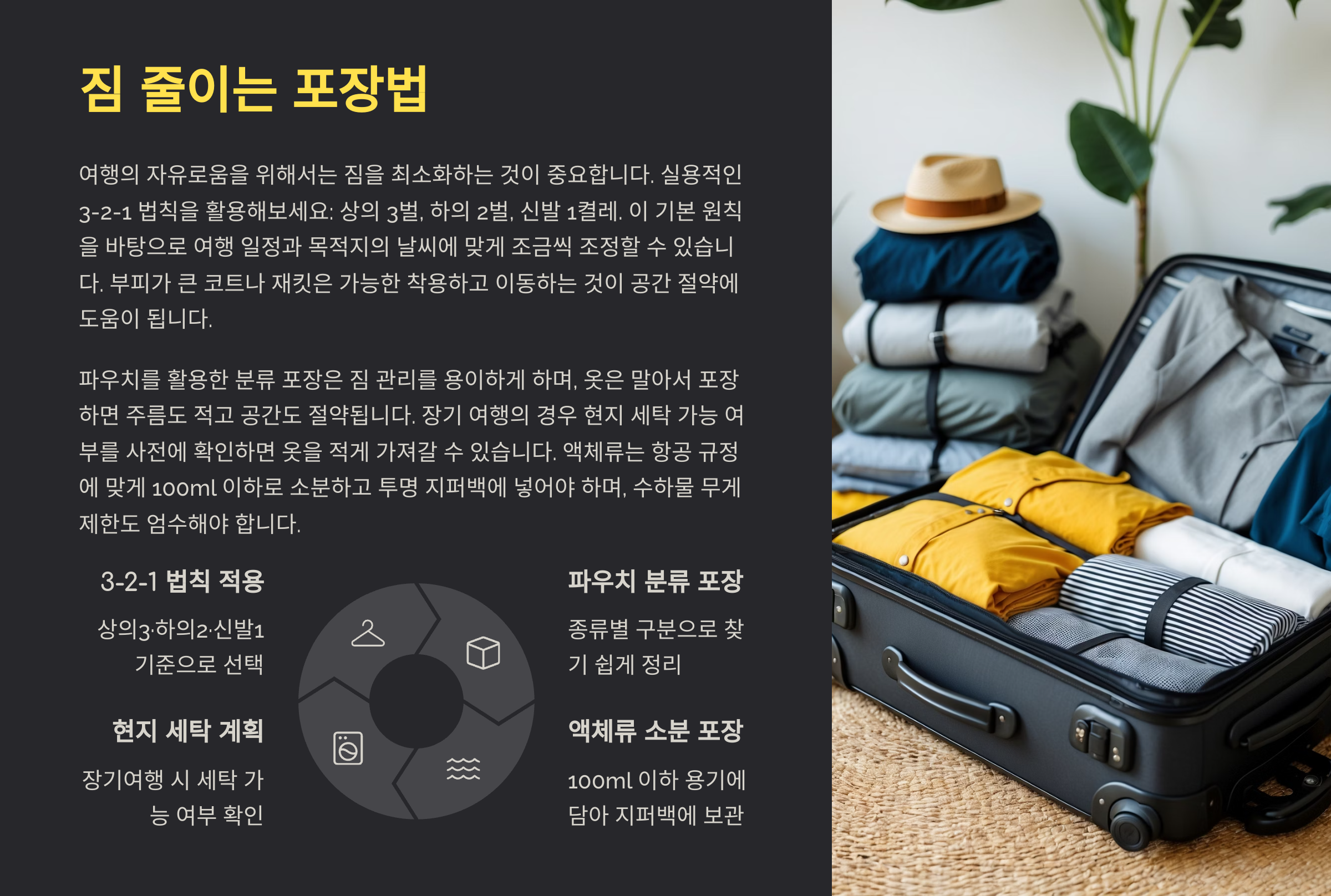 여행 짐을 싸다 보면 어느새 캐리어가 꽉 차버리는 경험, 많죠? 하지만 제대로 된 포장법만 알아도 짐 부피를 절반 가까이 줄일 수 있어요. 특히 저가항공을 이용할 땐 수하물 무게 제한이 엄격하니, 가볍고 효율적인 짐싸기가 정말 중요해요!