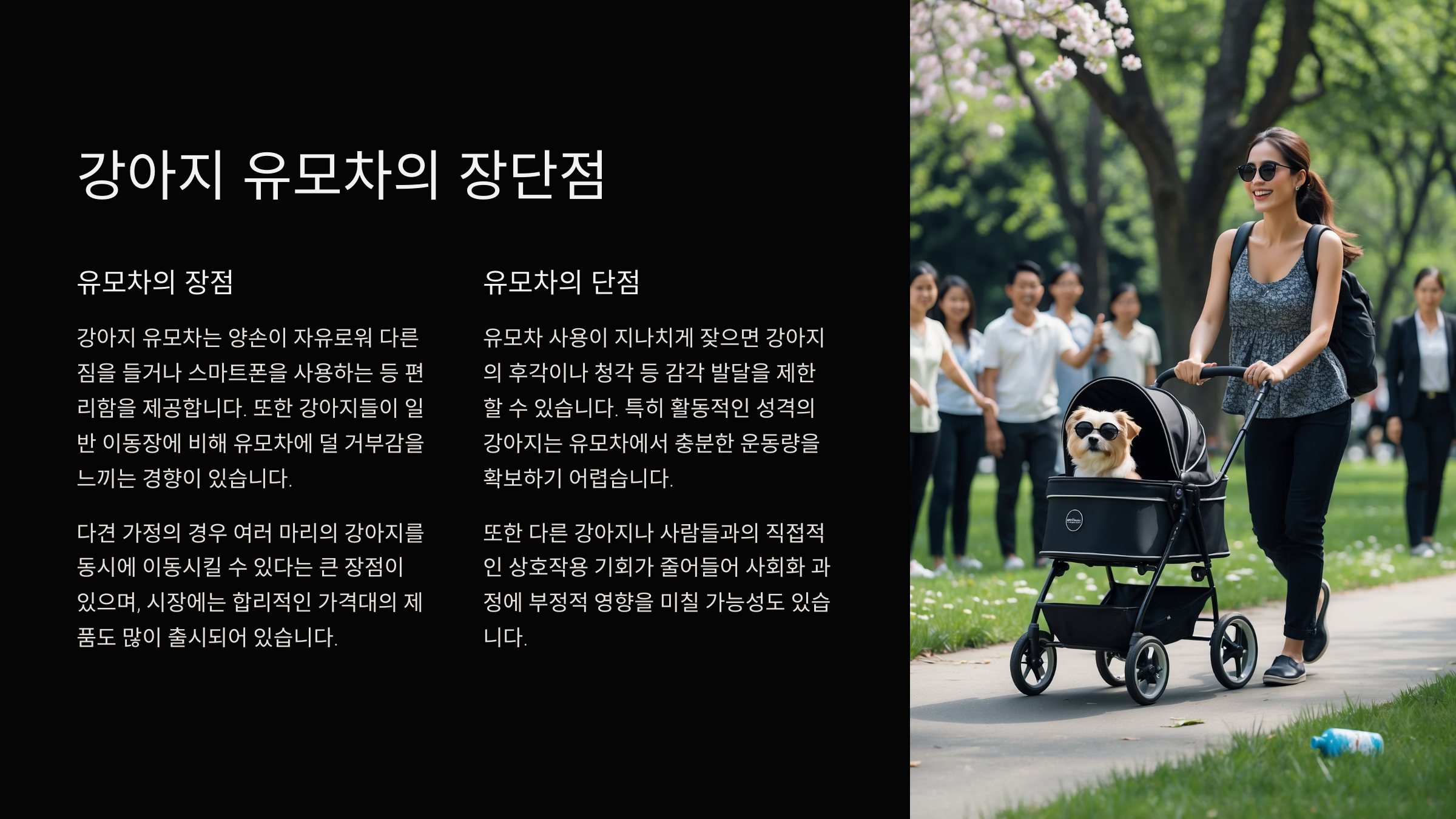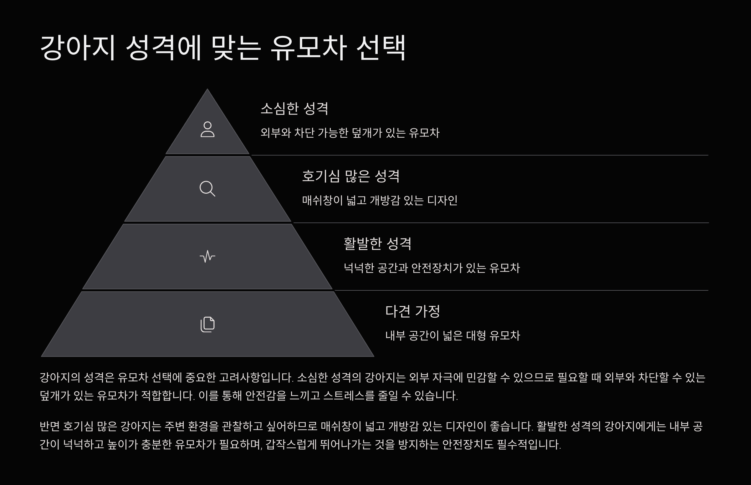 | 다견 전용 유모차 | 넓은 공간, 2마리 이상 가능 | 다견 가정, 대형견 포함 |