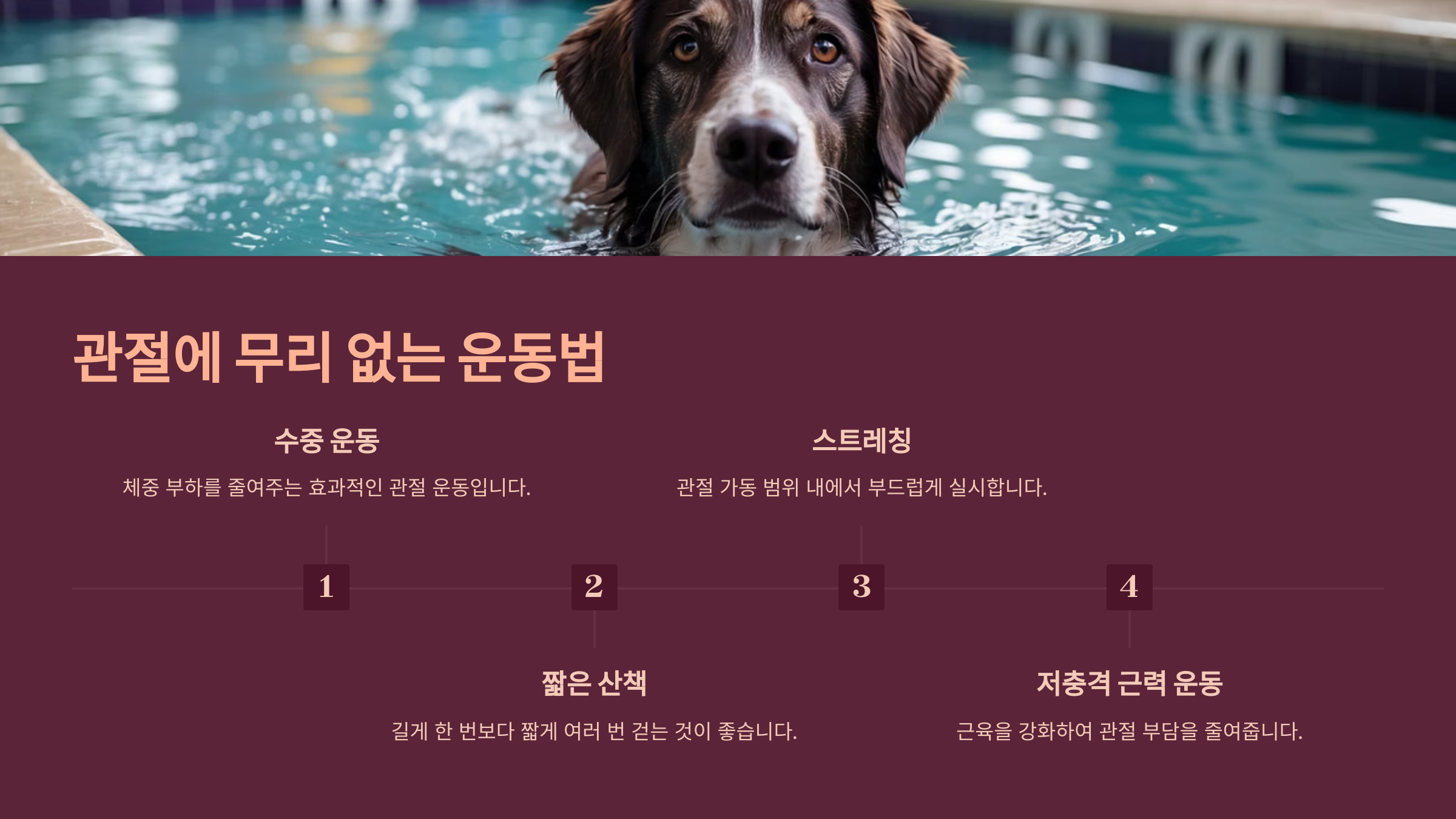 특히 실내 수영은 무릎에 무리가 전혀 가지 않으면서 관절을 튼튼하게 해줘요! 최근엔 강아지 전용 수영장도 많아서 여름엔 자주 방문해보는 것도 좋아요 🏊♂️