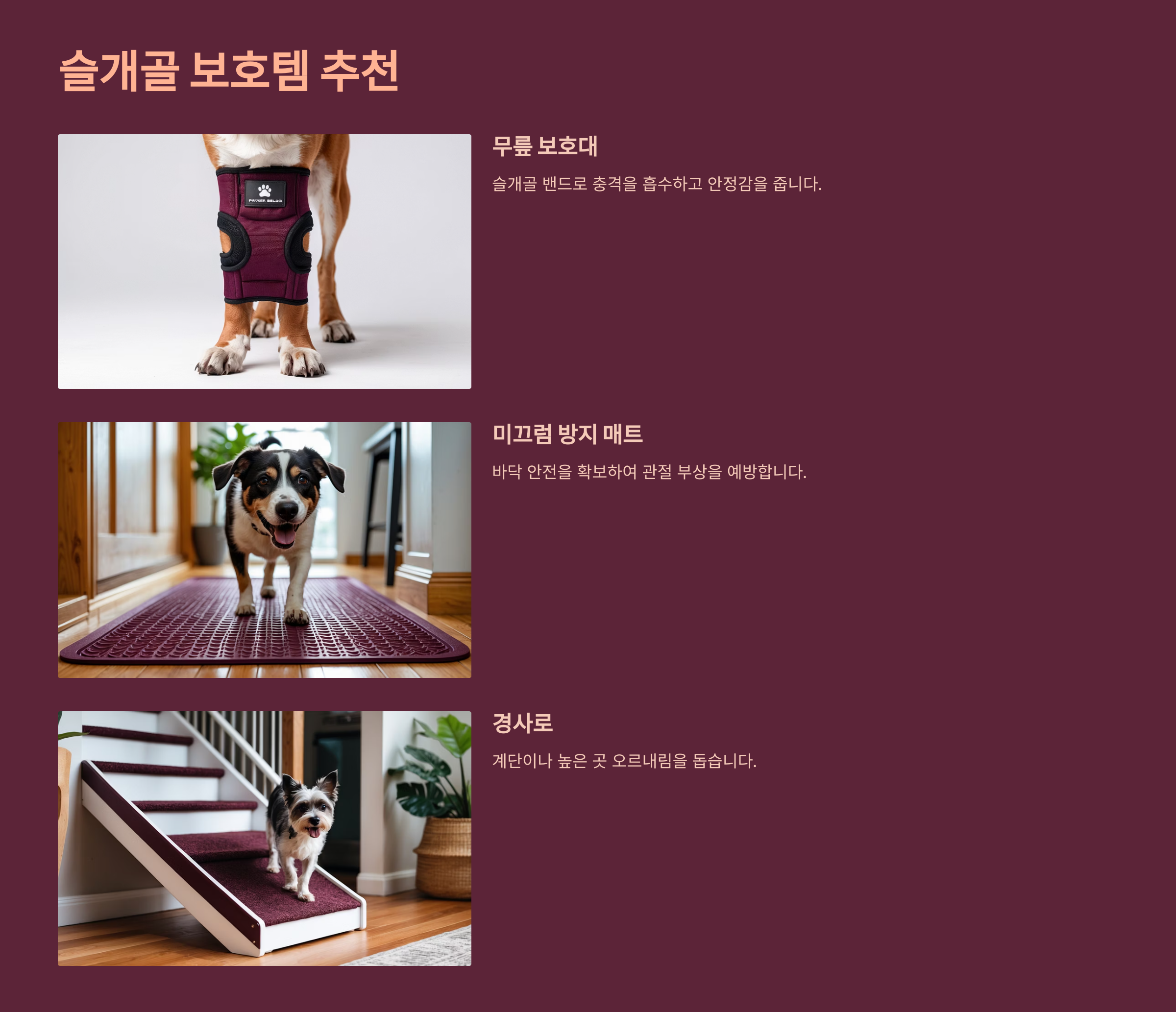 이 중에서 가장 기본적으로 추천하는 건 ‘계단’과 ‘미끄럼 방지 매트’예요. 대부분의 슬개골 문제는 점프와 미끄러짐에서 시작되니까요 🧱