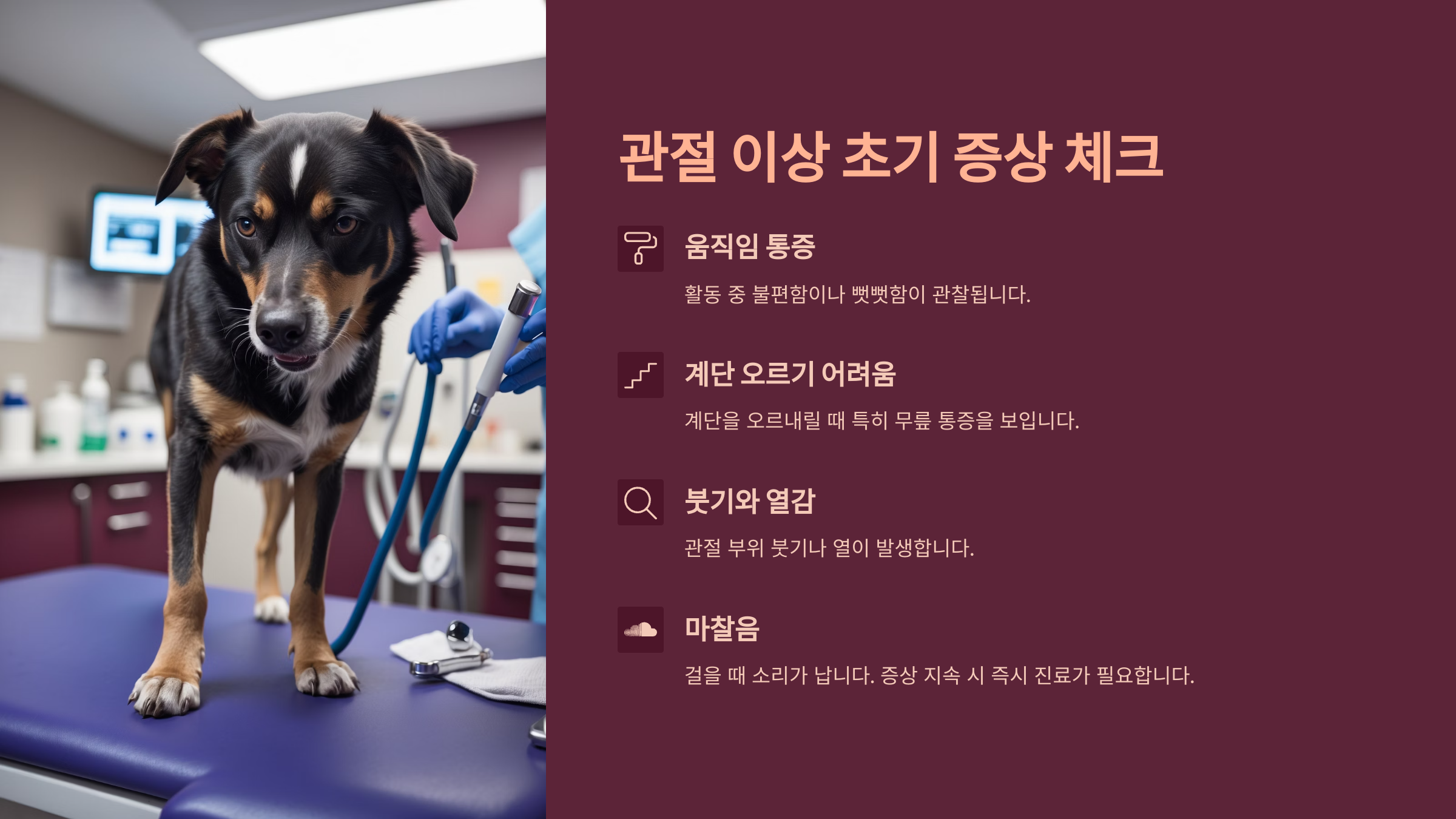 강아지는 관절이 아프다고 직접 말하진 않지만, 행동을 보면 분명히 ‘신호’를 보내고 있어요. 보호자가 이걸 얼마나 빨리 눈치채느냐에 따라 아이의 고통 기간이 달라지죠.