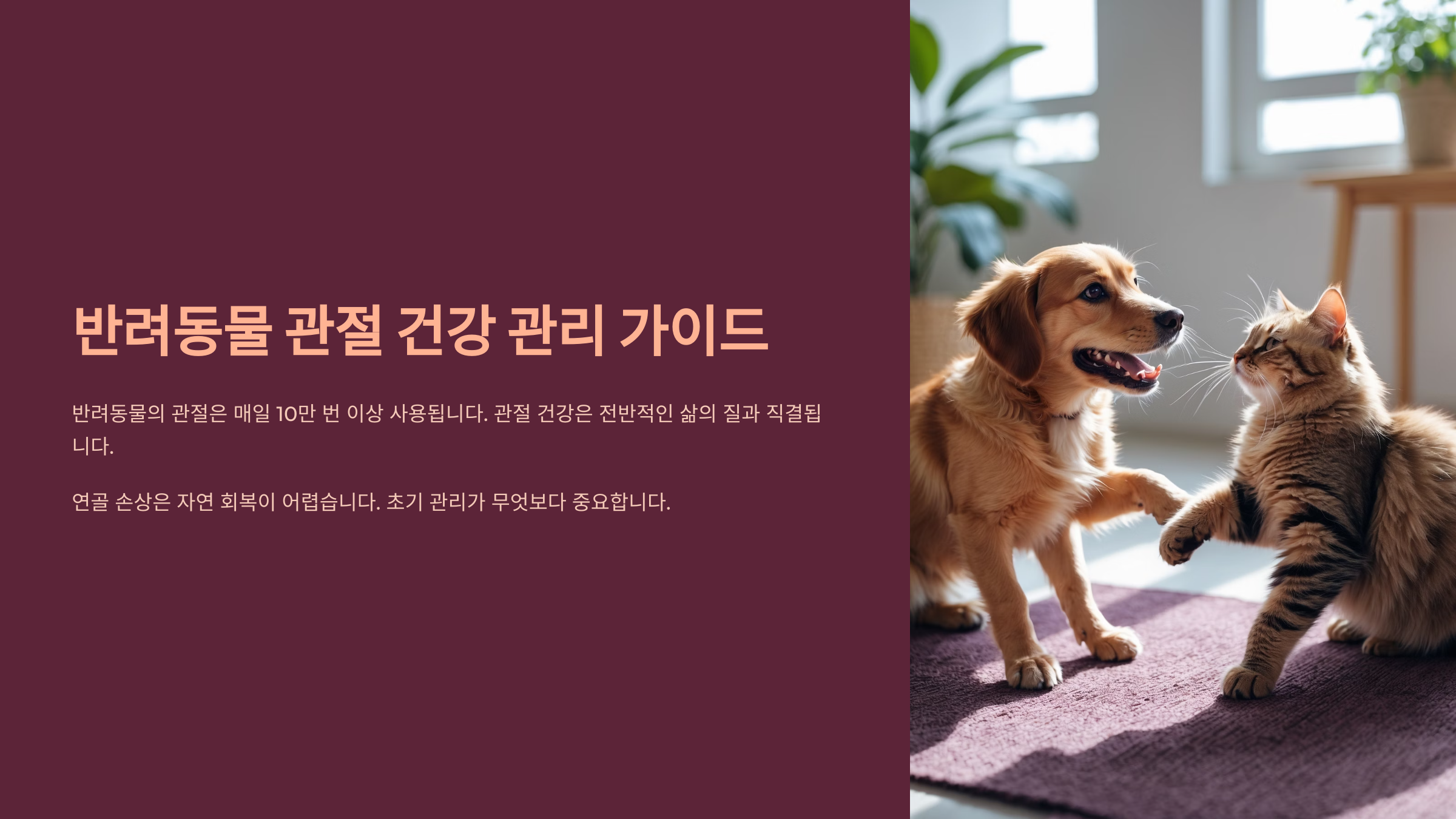 관절 질환은 단순한 걸음걸이 변화로 시작하지만, 진행되면 걷지 못하거나 수술까지 이어질 수 있어요. 그래서 평소에 바닥재, 계단 이용, 사료 선택 하나하나가 중요한 거예요.