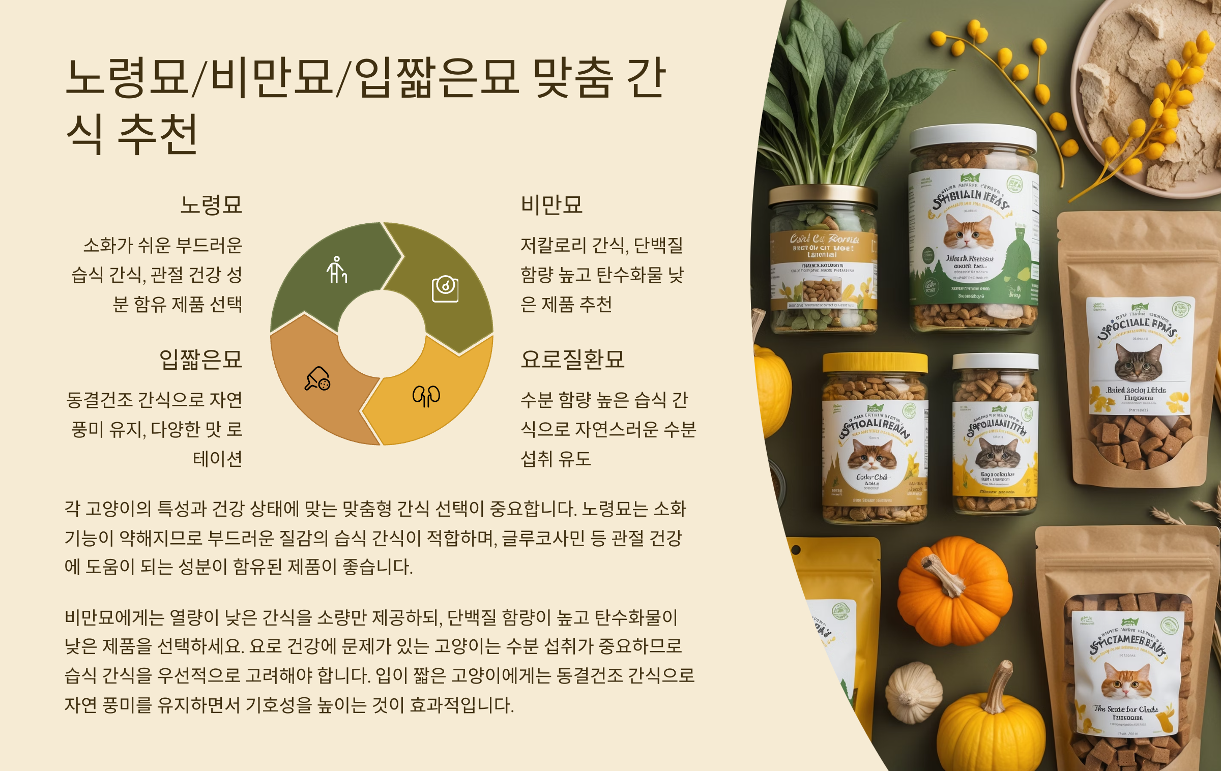 고양이의 나이, 건강 상태에 따라 필요한 간식도 달라요. 특히 노령묘나 비만묘, 입이 짧은 고양이에게는 일반 간식이 맞지 않을 수 있어요. 이럴 땐 기능성 간식이나 저칼로리 제품, 부드러운 질감 위주의 제품이 좋아요.